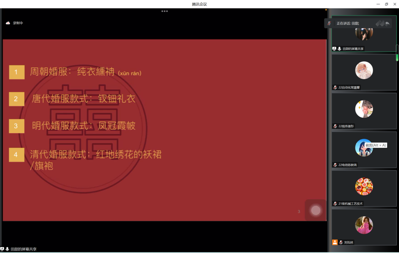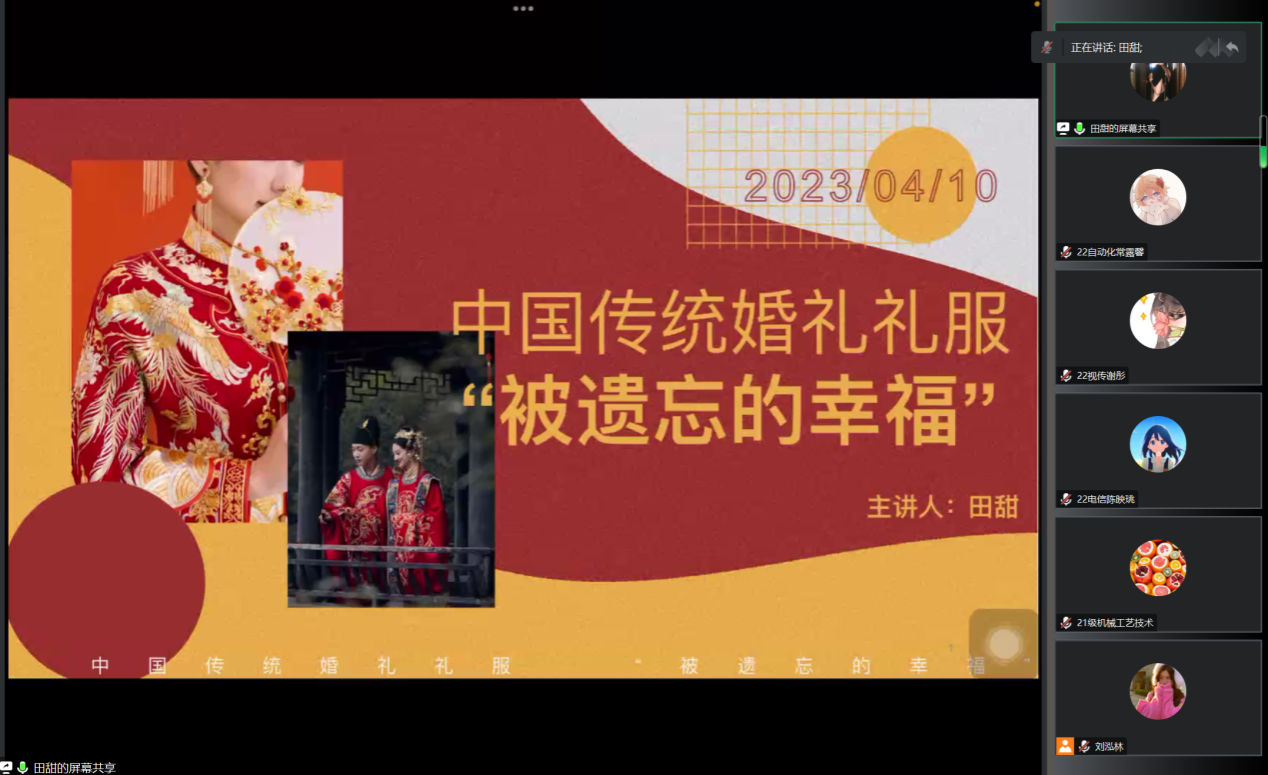 (通讯员 常露馨 刘明芳)4月11日中午,工程与设计学院开展以“中国传统婚礼礼服——被遗忘的幸福” 为主题的线上精勤讲堂。2021级服装设计专业田甜主讲此次会议,参加此次会议的还有工设院2021级与2022级的学生。