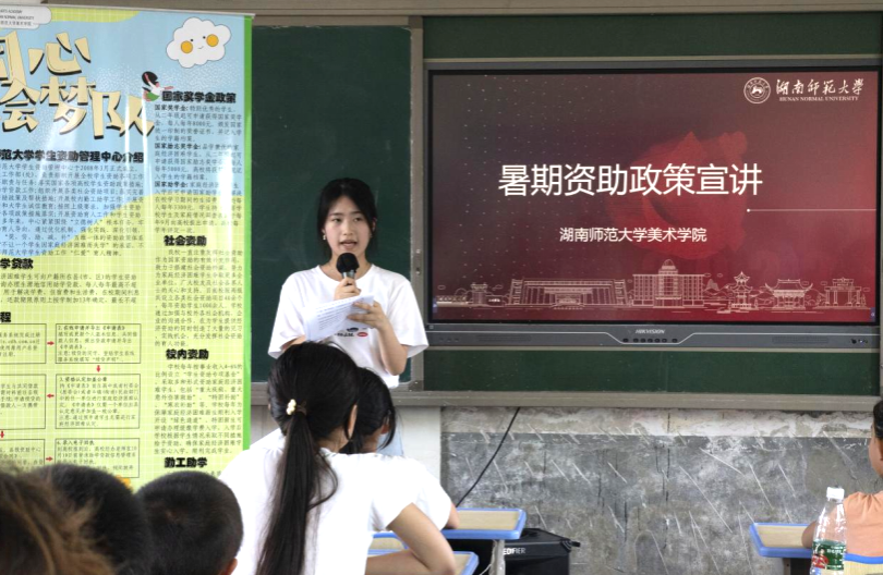 (通讯员 谭竞 庄栩乐)为深入落实国家资助政策,响应我校宣传国家资助和助学贷款政策工作的部署,我院以暑期社会实践时期为契机,进一步增进乡村学子对国家资助和助学贷款政策的深入了解。7月3日下午,美术学院“同心绘梦”队赴益阳市张家塞乡胜利小学开展“解读未来,共筑梦想”资助政策宣讲会,会议由美术学院学生工作办公室辅导员唐士晋主持,外国语学院2022级本科生黄薪诺主讲。