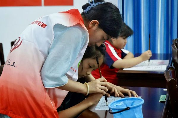 实践团成员杨佳逸指导小朋友们写毛笔字