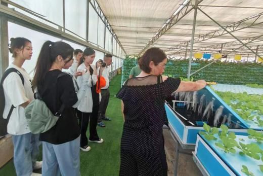 大祥区因地制宜推进乡村振兴,蔡锷乡紧抓红色旅游资源,以红色文旅助推乡村振兴;而台上村探索智慧农业,以产业发展巩固脱贫攻坚成果。实践团成员在邓书记的带领下,首先参观了助农直播间,台上村通过网络直播的方式,推广当地特色农产品。之后,团队成员前往无土栽培基地。基地内四季青、紫苏、黄瓜等蔬菜瓜果生长茂盛。工作人员介绍说:“这些蔬菜是用特制的培养液培育出来的比在土地里生长的蔬菜生长速度更快,成熟时期可以适当延长,经济效益更高。”团队成员与基地工作人员进行了深入交流,进一步了解到无土栽培蔬菜的培育过程和家庭化的发展方向。此外,实践团成员还了解到台上村打造了村花博园、农耕文化长廊、向日葵种植基地等诸多特色旅游景点,吸引游客到访参观,探索农旅商业化发展方向。