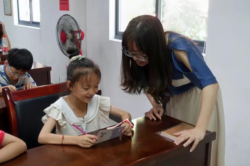 主讲人张依玲正在指导社区儿童制作爱心明信片
