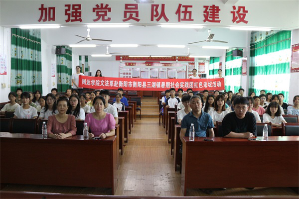 (通讯员 郭薇 晏鑫宇 曾茜妮)7月8日上午,我校树达学院文法系暑期社会实践团赴三湖镇鼓峰中学组织红色论坛活动。此次红色论坛以宣扬党的二十大精神为主题,鼓峰中学总务主任王青、鼓峰中学高级教师王萍、鼓峰中学教师阳美玲、团队指导老师毛一受邀参加。团队副队长银姿、郭薇担任活动主持人。