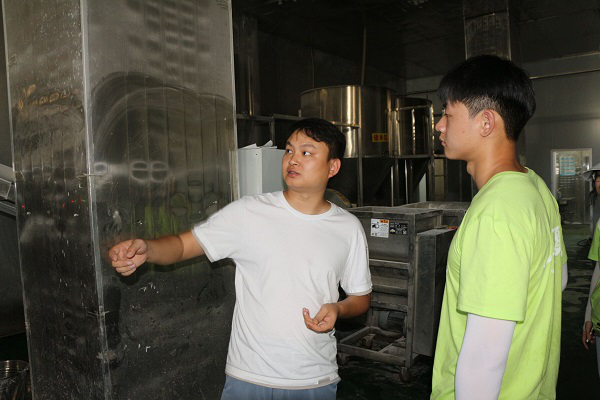 为研究家庭作坊与大型制造企业制造渣江米粉的区别,实践团成员前往大型制造企业调研,湖南渣江米粉制造有限公司总经理赵勇向实践团成员展示了工厂全自动一体化制造米粉的过程,一条流水线只需要五位工人即可完成渣江米粉的生产。同时,赵勇表示大型工厂在淘米这一工序上更为细致,会在磨粉时加入百分之八的淀粉以保证米粉更有弹性,减少粘黏。此外,米粉的晾晒方式分为晒干与烤干,而工厂通常采用更为卫生的烤干法。
