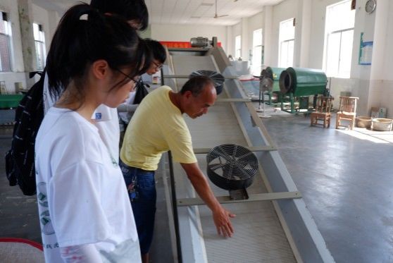 在名茶加工工厂,邓国清向成员们详细介绍了茶叶的制作过程。新鲜采摘的茶嫩叶经过杀青、清风、揉捻、初干、做条、烘干,达到十成干,再经过包装销往各地。其中名茶高桥银峰采用先炒后烘、清风去杂和首创提杂工序,既保持了芽叶干净,又能够保持白毫完整。银毫隐翠的外形,高香味鲜的内质博得了广大茶叶饮用者的喜爱,自其产出以来,生产供不应求。