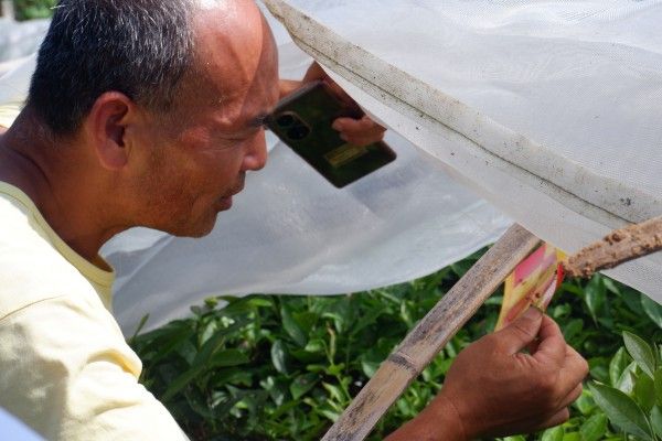 在茶圃调研期间,实践团成员了解到:茶树种植区包含100多亩土地,每亩茶苗存活率都能保持在百分之九十以上,亩产量超十四万。谈及种植技术的进步,邓国清表示,现代茶叶种植更具规模化、标准化特征,茶园基本实现机械化管理。此外,邓国清向实践团成员介绍了苗圃病虫害实验地,技术人员在此地通过对照实验研究农药对小心叶甲虫的杀灭作用。同时,邓国清揭开覆盖实验茶树的纱网,向成员们展示了粘附在纱网上的数虫板,技术人员通过记录数虫板上小心叶甲虫的个体数来验证农药对害虫的防治效果。