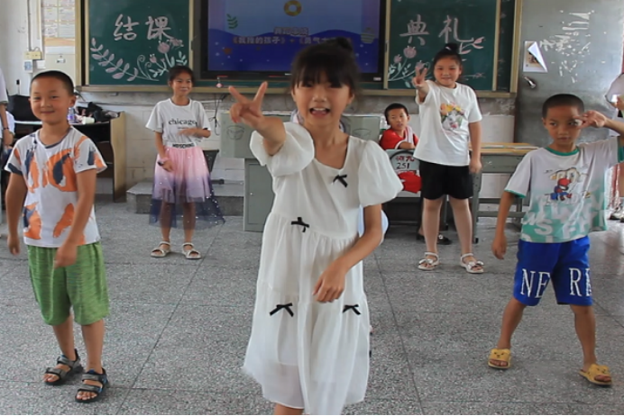 结课典礼伊始,胡晓雪就此次暑期创意活动班的教学成果进行总结,通过图片与视频相结合的方式展示了楠木铺九校学生在课程中所完成的舞蹈、声乐、书法、手工作品以及日记作业。随后,调研组成员与楠木铺九校学生共同表演节目,通过现场表演的形式展示此次课程的教学成果,包括舞蹈作品《我推的孩子》《勇气大爆发》,声乐作品《稻香》等。