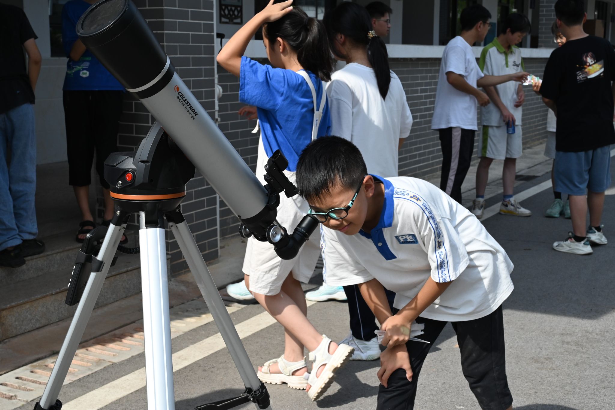 操场上,支教队将组装好的天文望远镜对准太阳,进行多次调试,确定在望远镜上可以观测到清晰的太阳黑子后,为孩子们讲解了望远镜的正确使用方法,开始组织孩子们进行观测。孩子们严格遵守秩序,在讲解员的辅导下,依次进行观测,并发挥想象力去思考“太阳黑子是什么?”“为什么会出现太阳黑子?”。孩子们的大胆猜测与积极思考得到了讲解员们的充分肯定,增强了他们学习天文知识的荣誉感和使命感,营造了积极的活动氛围。