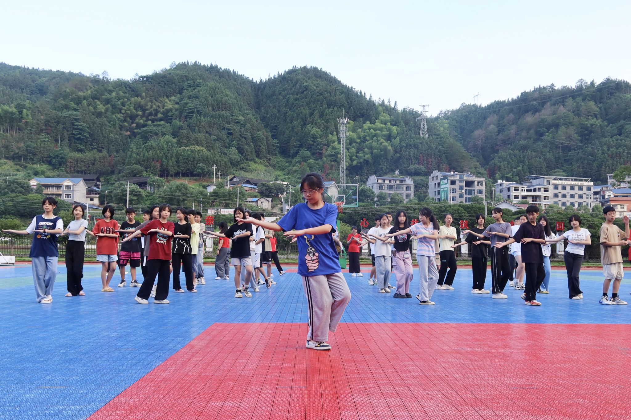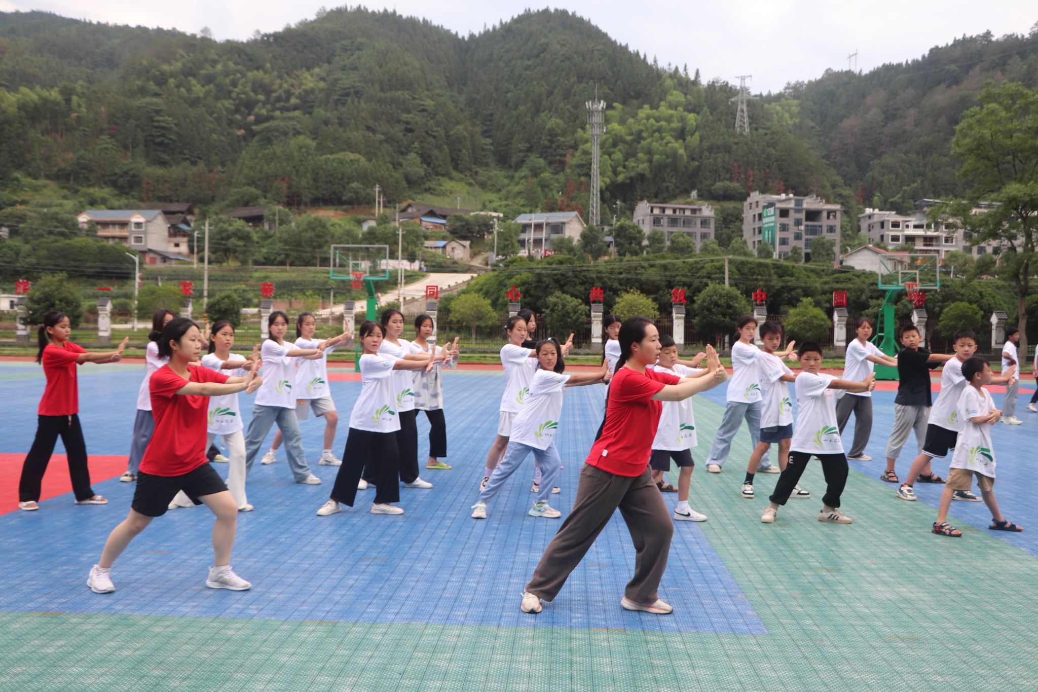 志愿者带领学生练太极拳