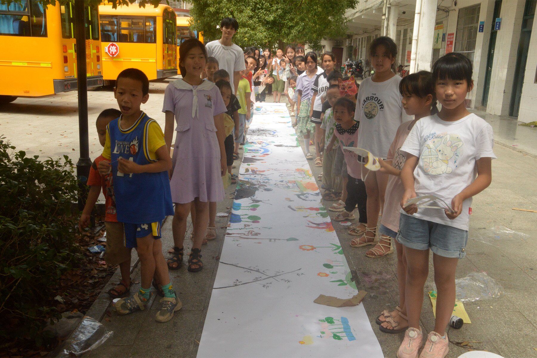 铺一席长卷,携画笔颜料,绘天马行空。“沅起非遗”团队在沅陵县七甲坪镇九校的支教工作接近尾声,教学组成员结合此前的教学情况,开展长卷绘画特色课程,在检验学生学习成果的基础之上引导学生充分发散思维,加强学生的观察能力、想象力以及动手能力,提高学生的综合素养。此次特色课程的开展,带领学生从身边取材,以大自然为工具,以想象力为媒介,鼓励学生以各种不同的方式绘画出自己的所思所想所感。学生初次体验长卷绘画,一方面是对自身学习成果的检验,另一方面又是对其团体协作能力的考察。
