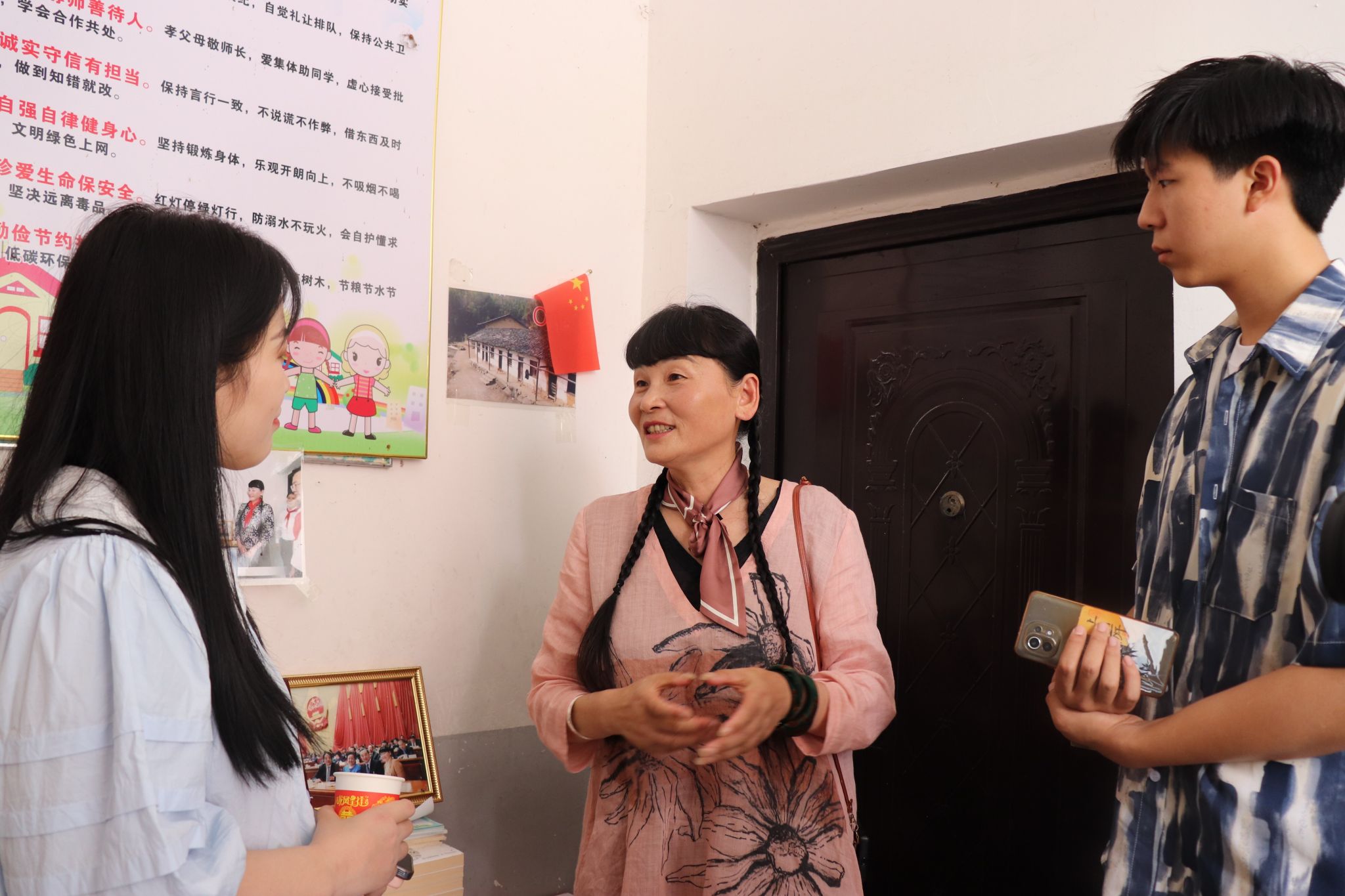 支月英热情地欢迎队员们的到来,并带领队员们参观白洋教学点。教学点里有张特殊的照片,那是几十年前还未改造的白洋教学点,只有一排破旧的青瓦房,四周用竹竿撑住,地上满是泥泞。对着这张照片,支月英向队员们讲述起过去的艰苦岁月。因为交通不便,她只能将生活用品和教学用品肩挑手提地带上山,她将微薄的工资拿去给孩子们垫学费,自己却连饭都吃不饱,还要去装车运毛竹来补贴。一次运毛竹时她出了车祸,被压在车下,昏迷了许久。醒来后,支月英却觉得这是上天的眷顾,自己在大山里的使命还没有完成所以才活了下来。这段惊心动魄的经历被支月英笑着讲出,千帆过境后的豁达在她的身上淋漓尽致地展现,队员们的心中除了尊敬更生钦佩之情。