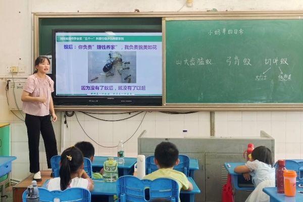 昆虫课堂上,彭润琴以蝴蝶的身体分节为例,引出昆虫的共同特点,借助不同昆虫的彩图教会学生辨别常见昆虫。梁雅菁用有关蚂蚁的小视频引入,从蚂蚁家族的构成和职责两个方面讲解蚂蚁的日常生活,带领学生在校园内用特殊工具采集蚂蚁。