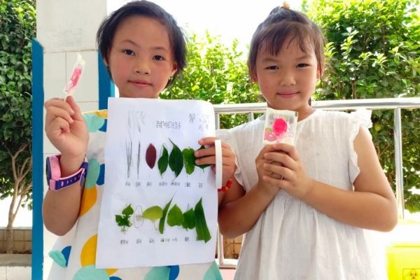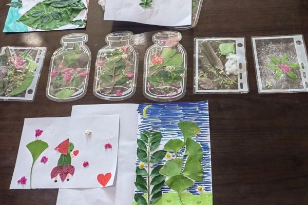 创意粘土以及植物拼贴绘画课堂上,王妍和梁雅菁带领学生在户外进行叶片的识别与采集。曹惊姿在课堂上展示不同的创意模型和制作特点,并组织学生利用粘土进行同步教学和分组练习。金雪儿和杨岱霏带领学生采集植物叶片、花朵等材料,引导学生观察不同植物形态特点,鼓励其结合绘画、剪纸自主设计并创作创意手工作品。