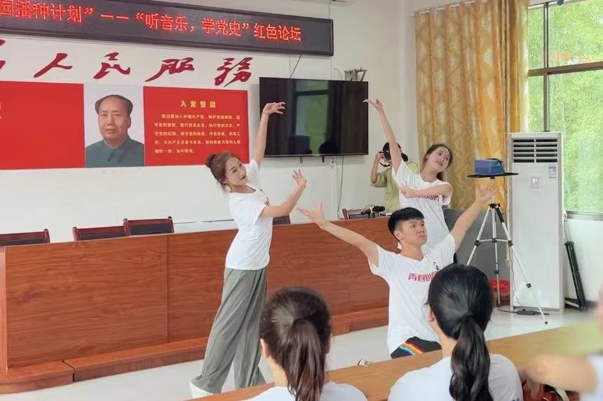此次活动旨在用艺术语言讲述红色故事,推动党史学习教育与艺术融合发展。沐浴着新世纪灿烂的阳光,历史的重任即将落在这一代青少年的肩上,我校赴花园阁村暑期社会实践团将会继续传颂红色故事,赓续红色基因,用我们的实际行动在这片红色的土地上,续写动人的故事,谱写壮美乐章。