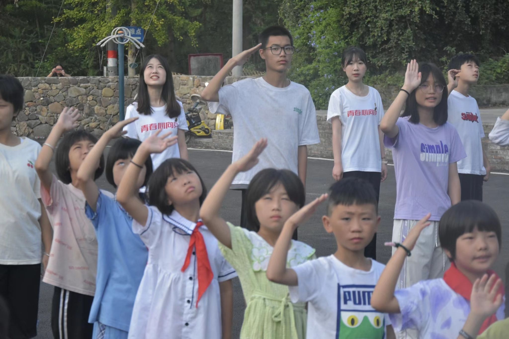“升旗仪式开始,请旗手出旗。”由学生代表及实践团成员组成的护旗手身披晨光踏着坚定的步伐入场,并将国旗护送至升旗台。“升国旗,奏国歌!”顷刻间,鲜艳的五星红旗在国歌声中徐徐升起,全体师生行注目礼,齐声高歌《义勇军进行曲》。