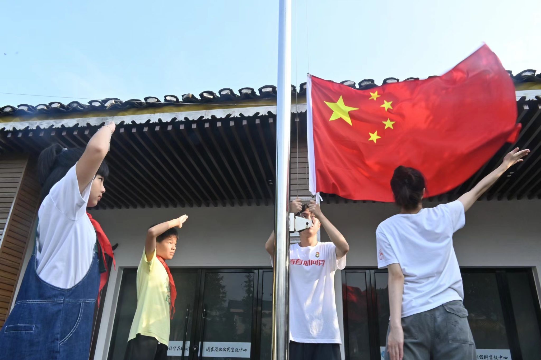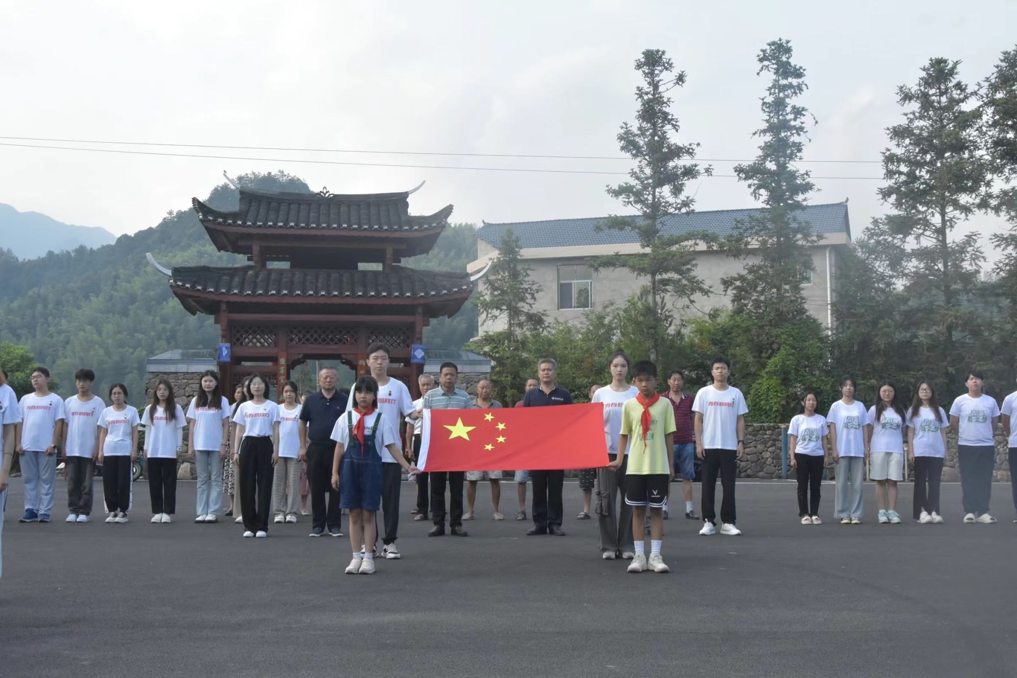 (通讯员 王锋志 柳紫依)“五星闪耀,皆为信仰;国旗飘扬,共谱华章。”为了培养孩子们的爱国意识,增强民族自豪感与集体荣誉感。7月17日上午,我校赴邵阳市绥宁县花园阁村暑期社会实践团举行了以“青春心向党,共谱新华章”为主题的升旗仪式。