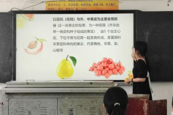 为激发学生对于生物科学知识的探索欲,梁佳洁带领同学们进行水果识别。梁佳洁介绍花的基本结构、果实的基本结构和常见水果食用部分来源三部分。实践团成员分发西瓜、李子、梨子、荔枝和柠檬五种水果,梁佳洁告诉同学们果实并非都由子房壁发育而来,包括花托、花萼、花冠,甚至是整个花序参与发育的果实称为假果。认识完果实的基本类型后,梁佳洁播放图片让同学们抢答果实类型,帮助他们将教学知识运用于实践当中。