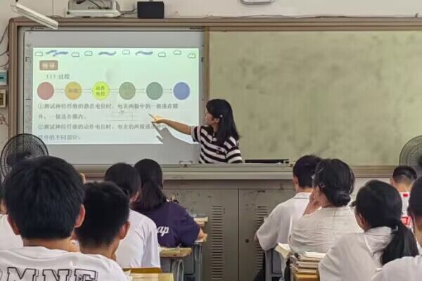 李悦利用思维导图并结合物理学知识为同学们解释反射过程中局部电流的形成过程,她讲述了兴奋在神经纤维上传递的过程与特点,以提问互动的方式带领学生们思考课本内容,帮助学生理解知识点含义,并对课堂内容进行总结。课后班主任罗春园对李悦提出建议,她鼓励李悦通过图画的方式让同学们更深入的了解问题,并学会适当放慢讲课速度,为同学们留下独自思考的时间。