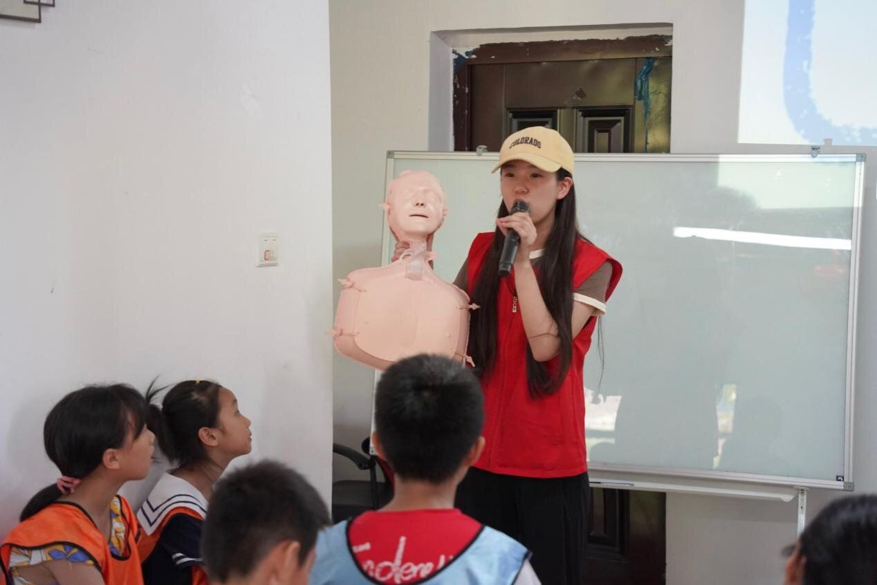 董馨婷通过模型向孩子们介绍急救知识