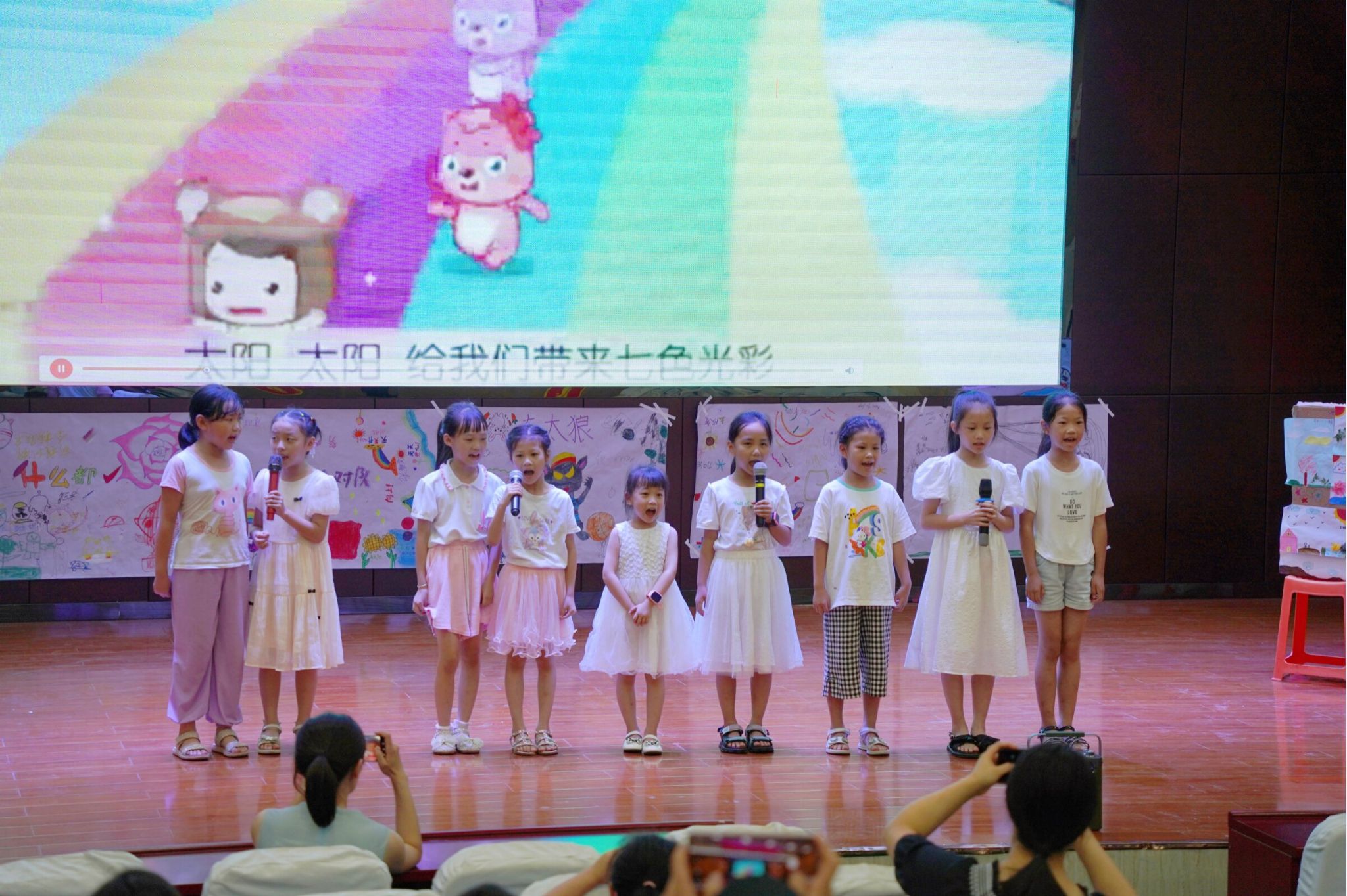 开场节目为星空班学生演绎的绘本故事《一粒种子改变世界》,学生们用青涩但真诚的方式展示了袁隆平的杂交水稻对世界的影响。在课程成果展示环节,学生们通过英语唱跳节目《兔子舞》和安全情景剧《急救二三事》展现了实践营里的所学知识。在随后的班级合唱《七色光》、《走,一起去看日出吧》中,清澈又响亮的声音呈现着的是同学们的童真与认真,承载着的是不同年龄段的同学们各自的风采。