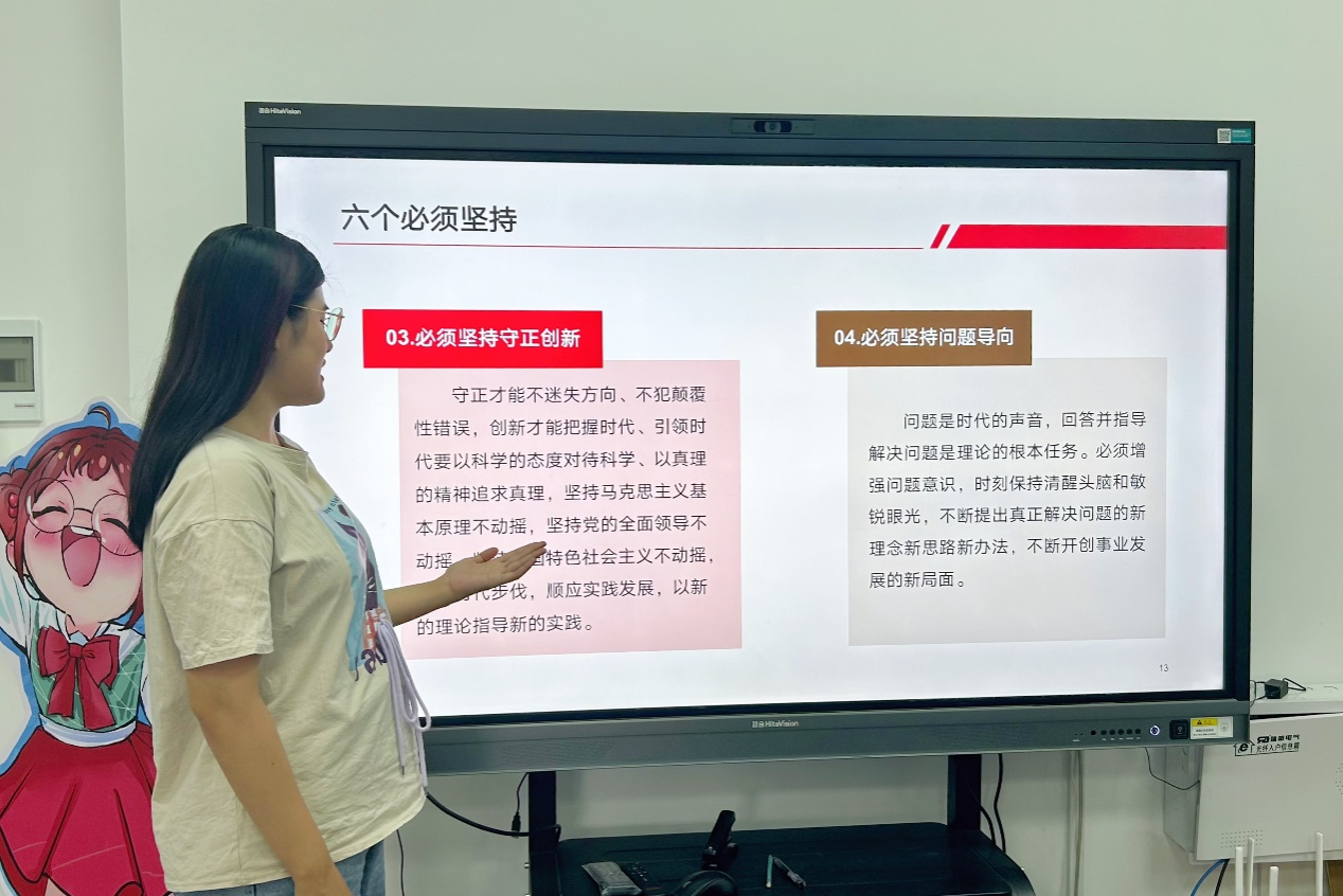 此次主题理论学习活动重点围绕“两个结合”、“六个必须坚持”、“十个明确”、“十四个坚持”、“十三个方面成就”等内容开展学习研讨。吕汶芯分别就上述内容从“是什么”、“为什么”、“怎么做”三个角度进行讲解,同时她认为研究生支教团成员作为新时代青年,需要挺膺担当,要坚持自觉主动学、及时跟进学、联系实际学、笃信笃行学,努力做到学而信、学而用、学而行,把学习成效体现在生活实践中来。