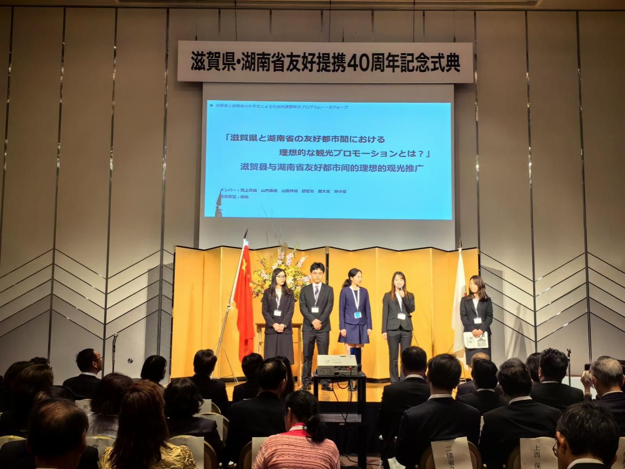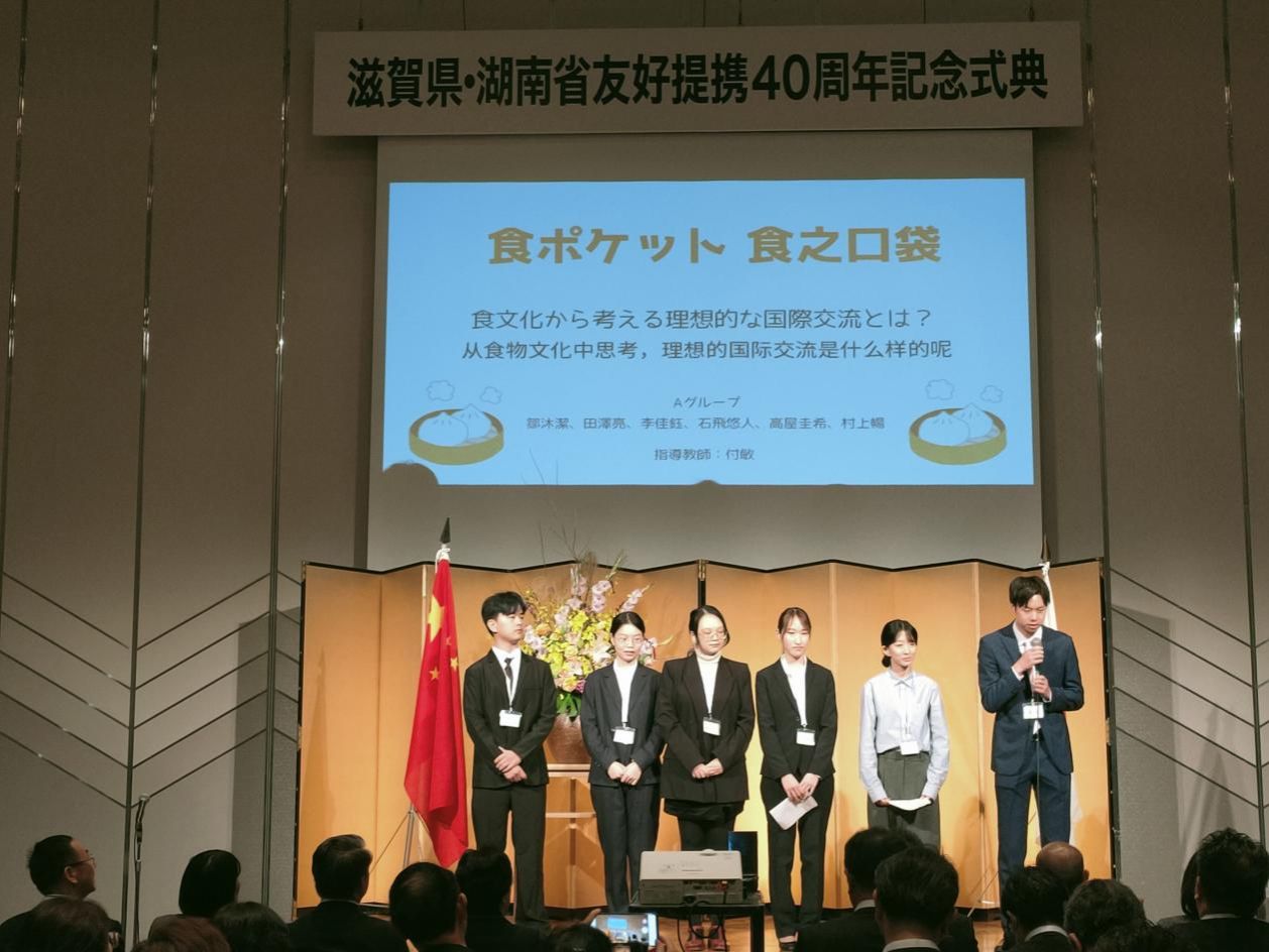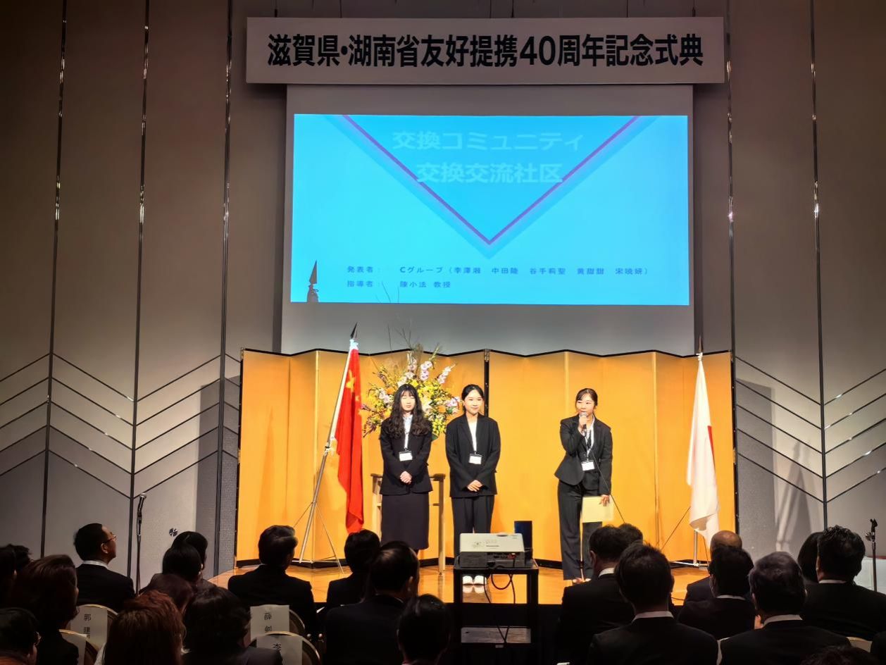 在纪念典礼的青年大学生成果交流发表环节,我校2021级日语专业本科生兰大进、2022级国别与区域研究专业硕士研究生李泽湘、2022级日语语言文学专业硕士研究生李佳钰在我校日语系主任陈小法教授、日语系冉毅教授等指导下,围绕“滋贺县与湖南省友好都市间的理想的观光推广”“滋贺县理想的民间交流形式:交换交流社区”“从食物文化中看理想的国际交流”等话题展开了生动的成果分享。吴桂英书记、三日月大造知事等与会领导、来宾对我校青年学子的精彩发言予以了充分肯定。