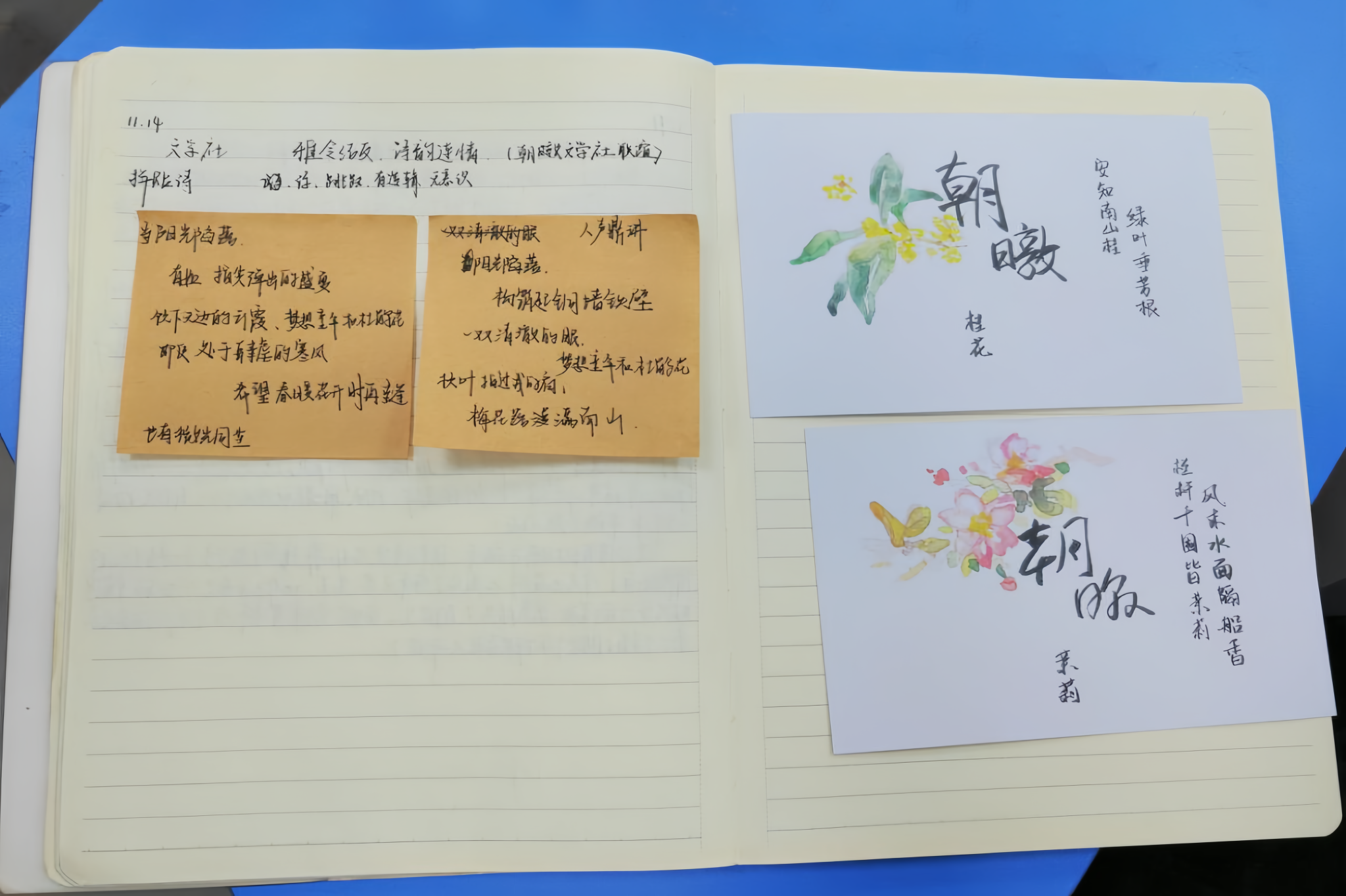 麓山外国语实验中学教师王娉预先与朝暾文学社核对好活动环节,并表达了对此次活动的期待。朝暾文学社理事提前到达活动地点,调试设备,摆设奖品,做好活动准备。苏文雅介绍了活动的主题与流程:连词成句,以诗传情,组合素材中的词语,并阐述自己的创作理念;将生活中的美融入诗句中,在巧妙的拼贴中发掘文学的魅力。夏源鸿、徐香为同学们分发了便利贴和卡片,学生们在思考后创作出了自己的诗句,并朗诵分享,相互交流。