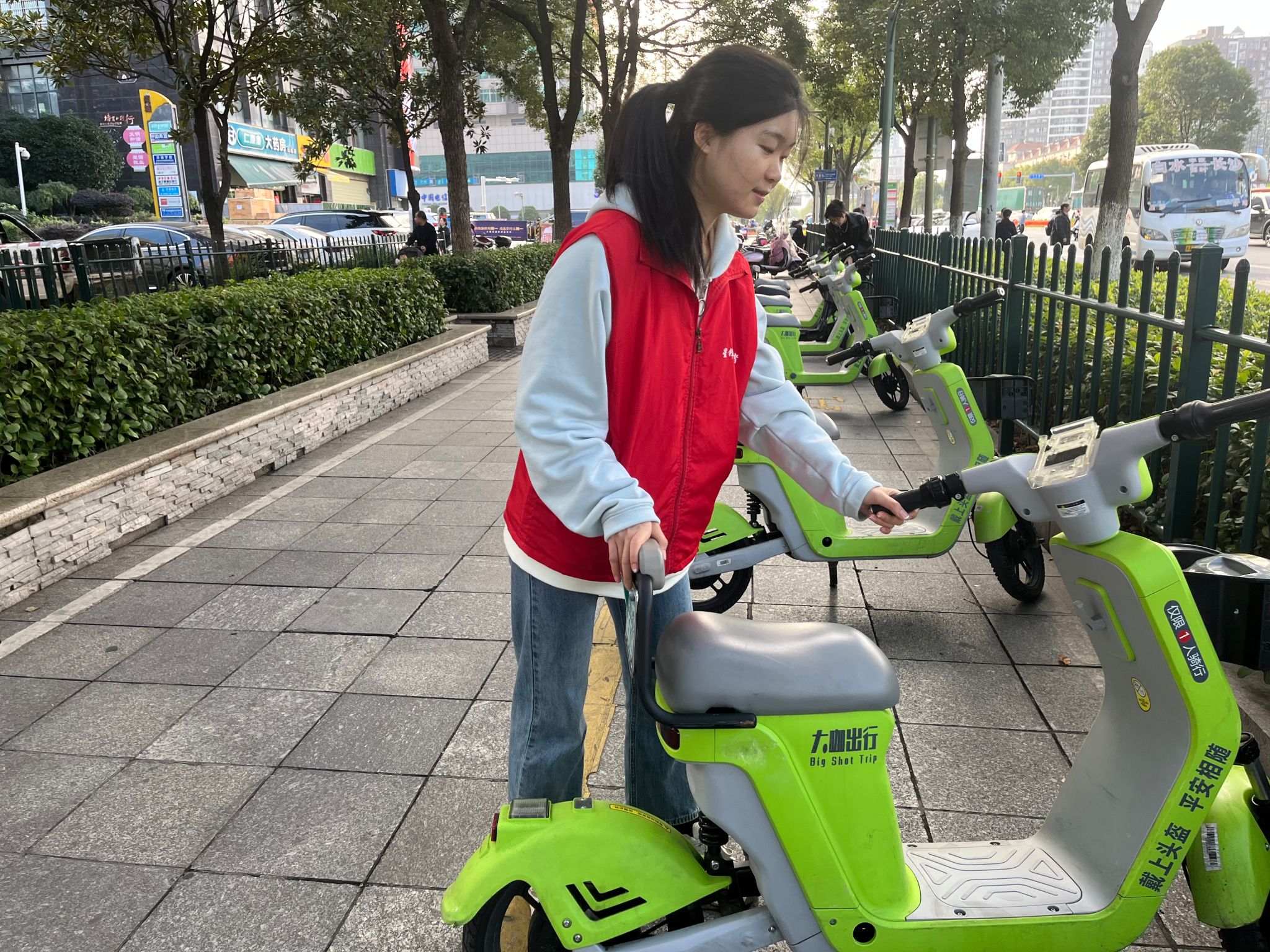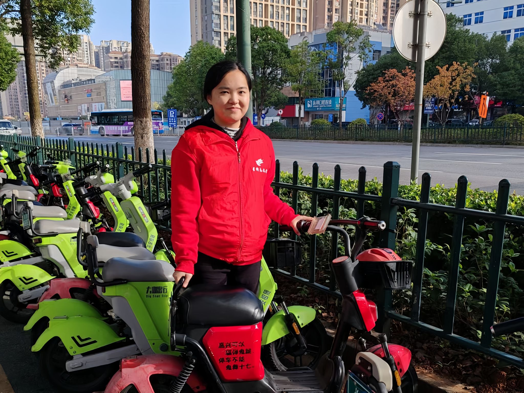 志愿者摆放共享电动车