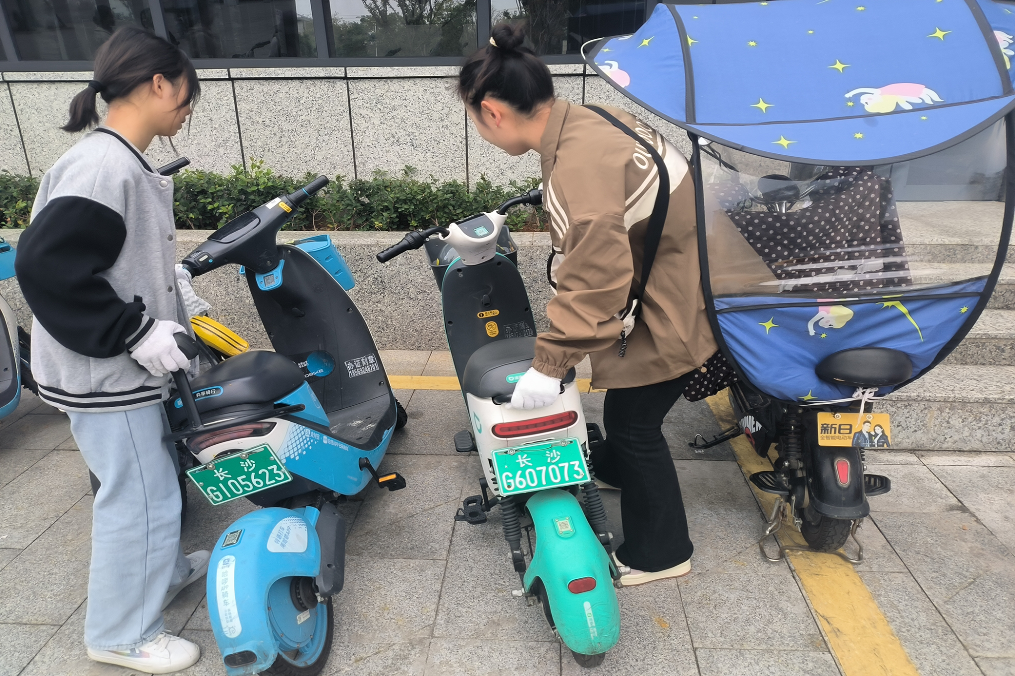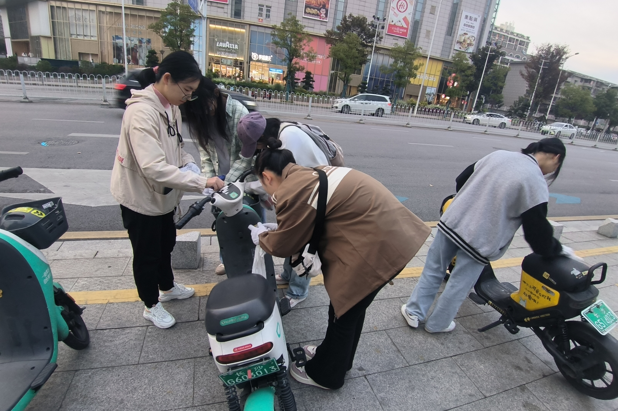 图为志愿者们仔细擦拭共享电动车上的灰尘和清理车辆上的广告标签。