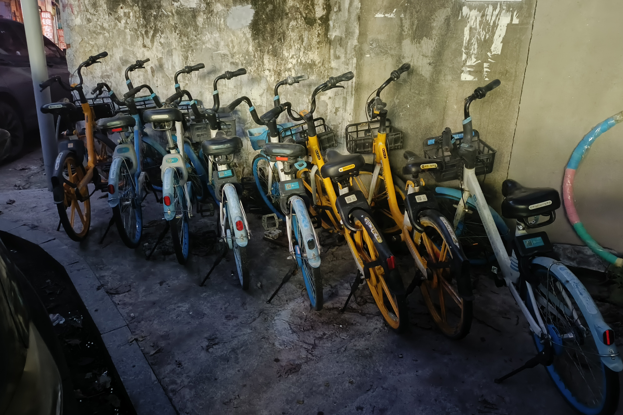 图为街道共享单车被志愿者们清理后整齐摆放。