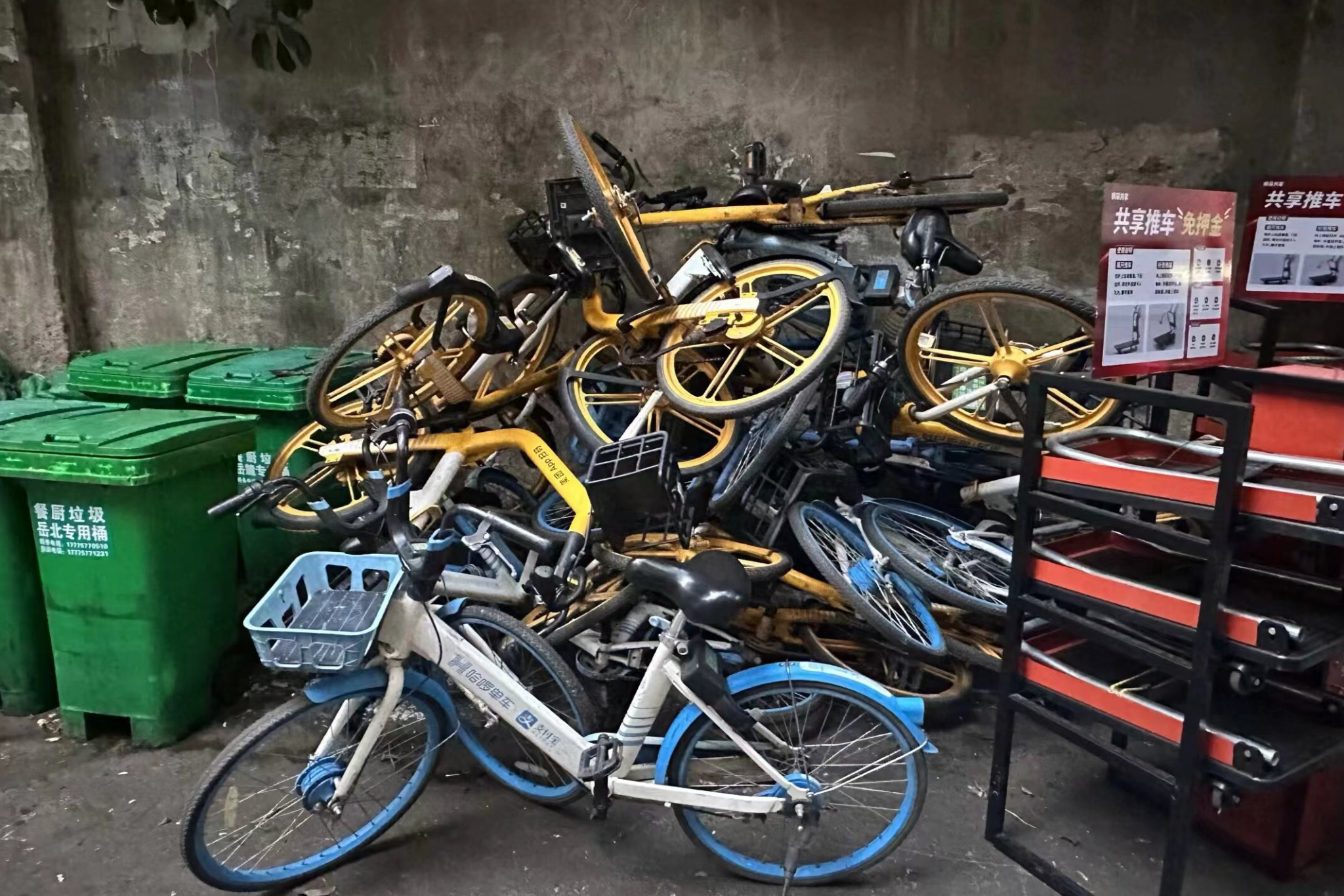 图为咸嘉湖校区南门街道路旁凌乱堆叠的共享自行车。
