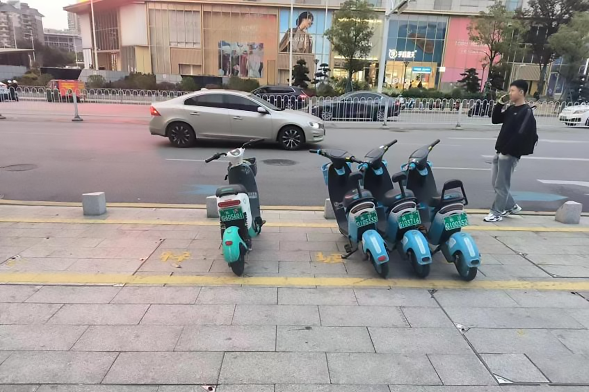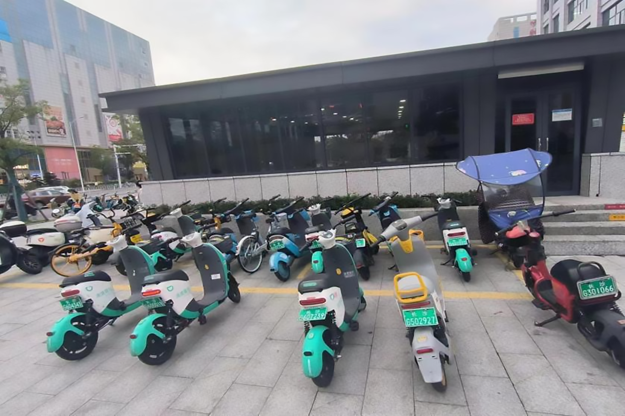 图为志愿者们整理后地铁站旁共享电动车区域的摆放情况