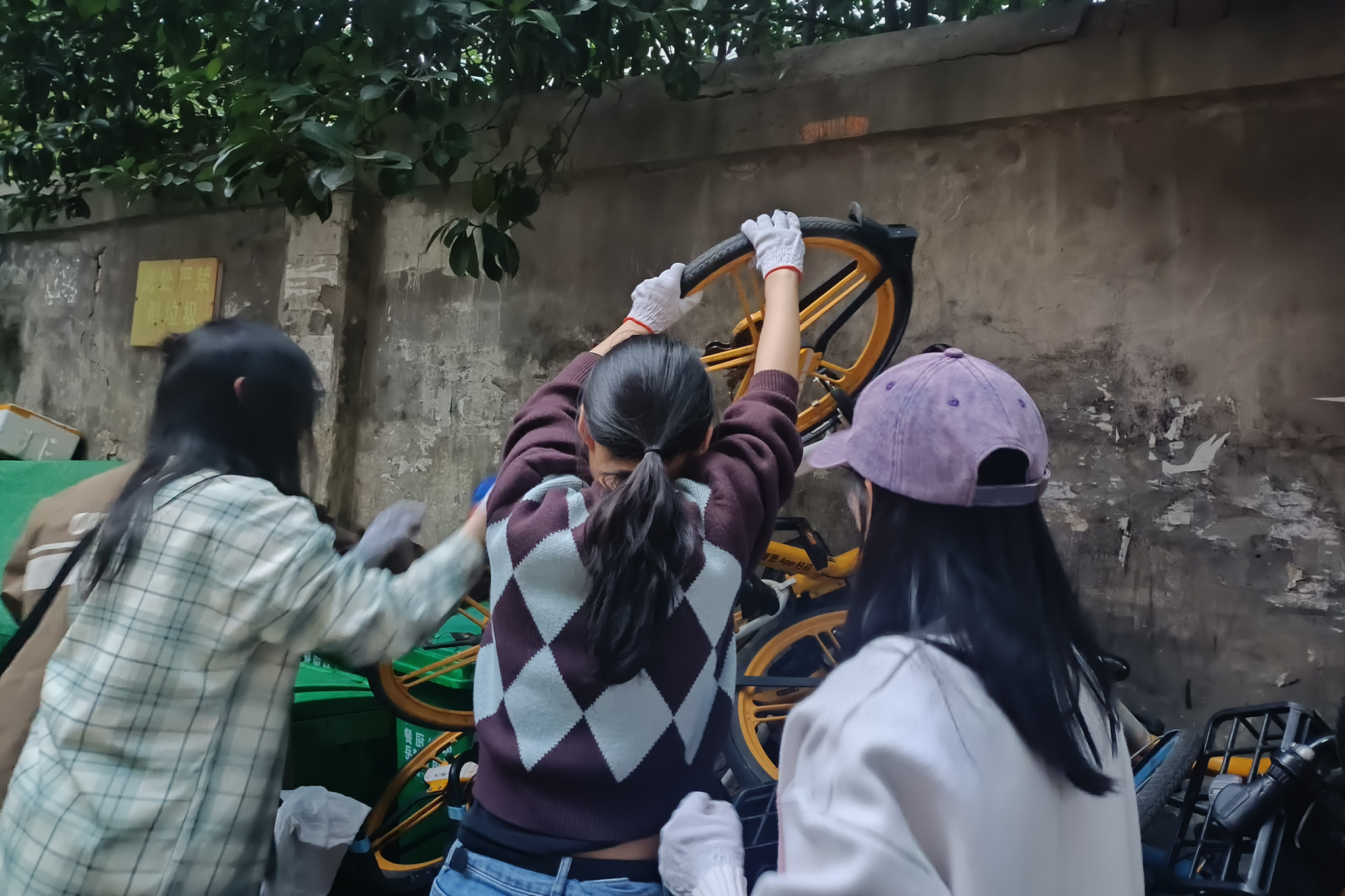 图为志愿者们将咸嘉湖南门街道凌乱堆叠的自行车搬下。