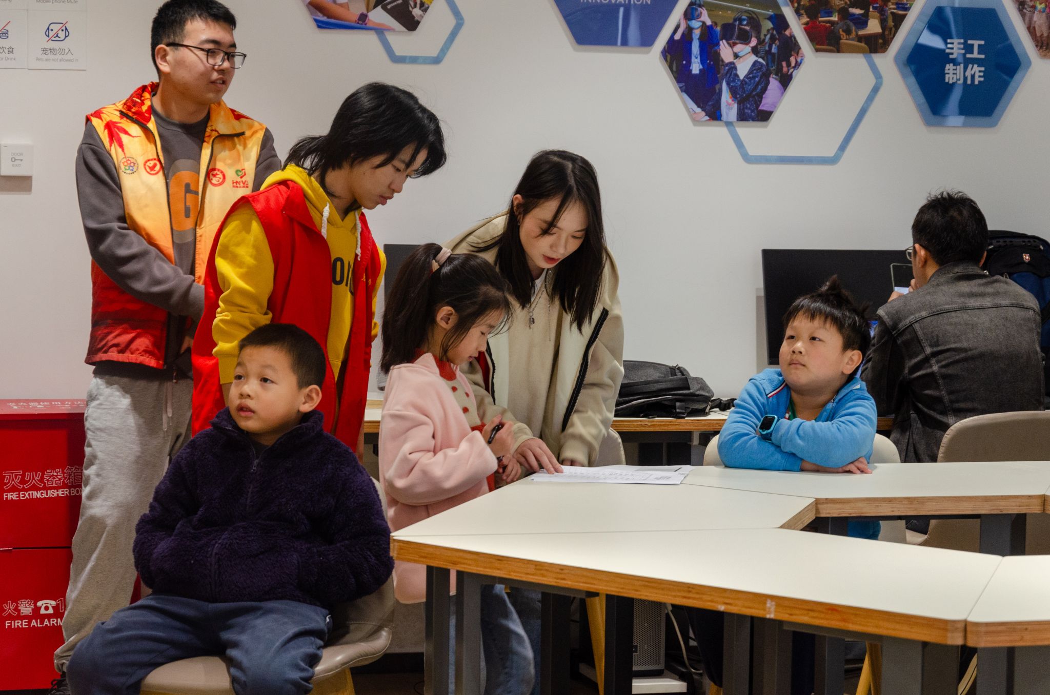 志愿者引导小朋友签到