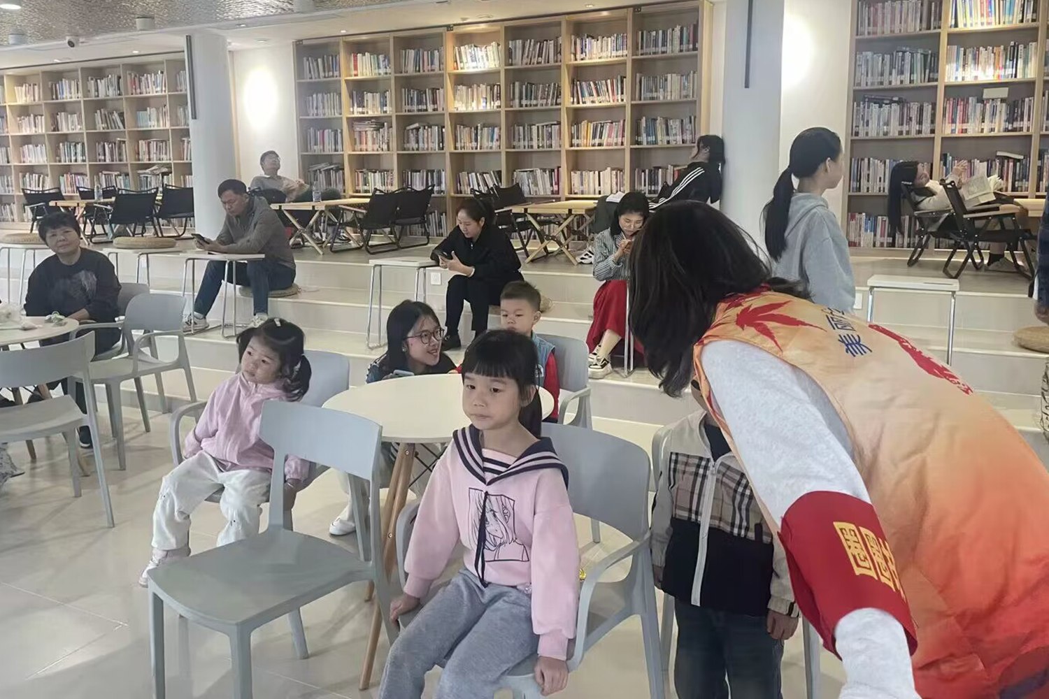 图为活动开始前,志愿者邀请孩子们进入书屋参与此次活动,并安排家长们有序签到入座