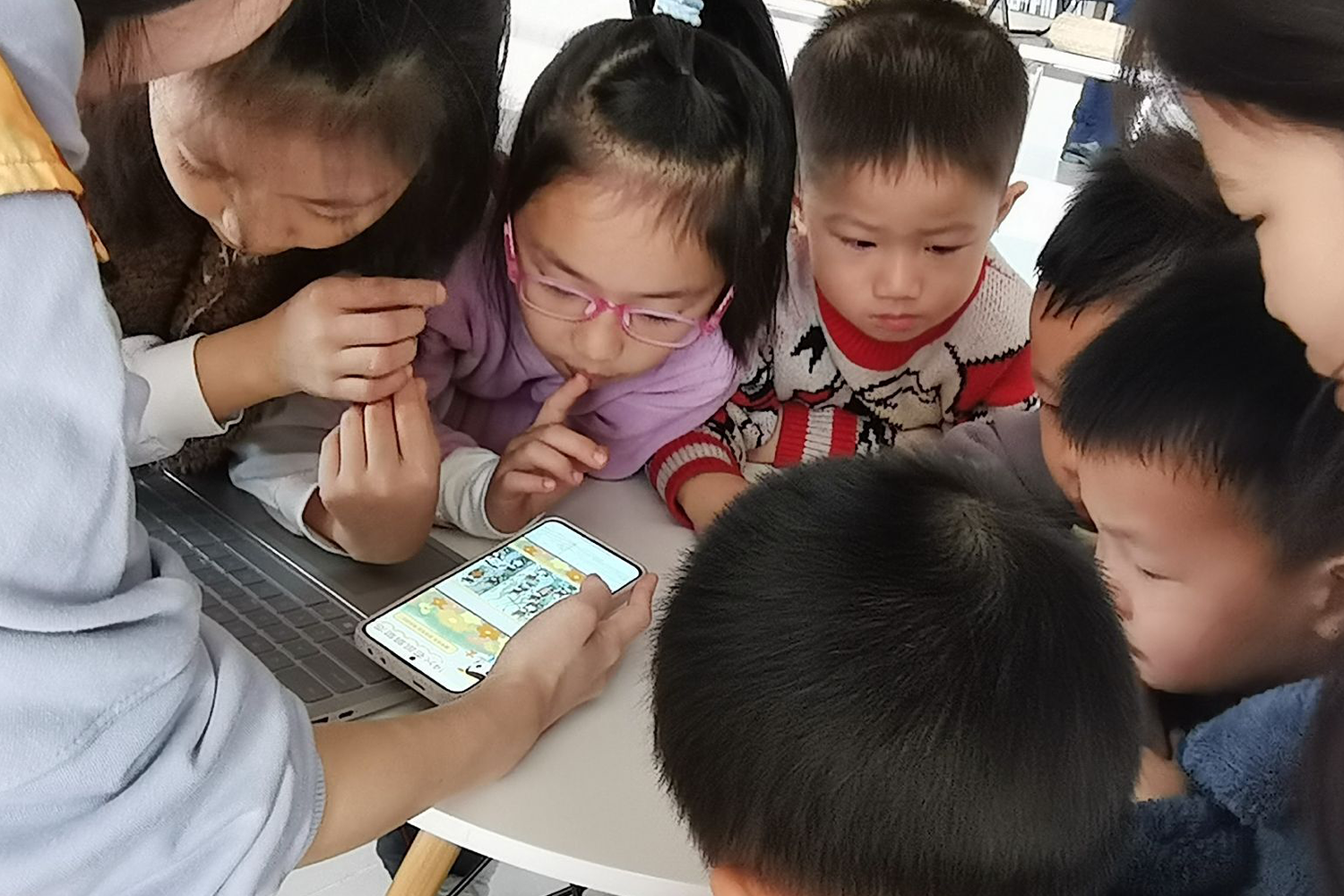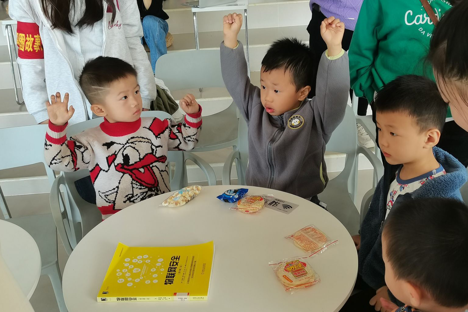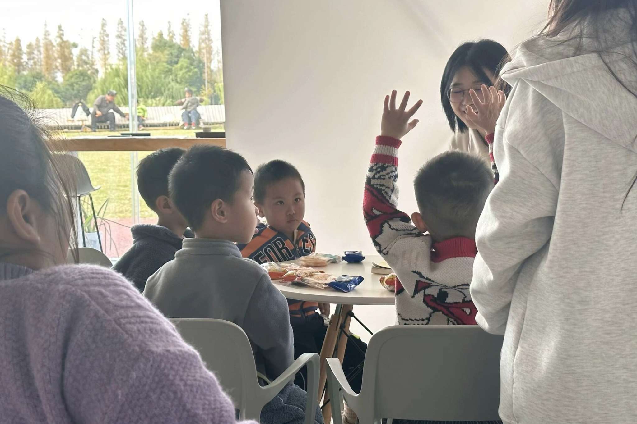图为小读者们开展反应力小游戏“大雨小雨”,在游戏中锻炼孩子们的认知能力和反应能力