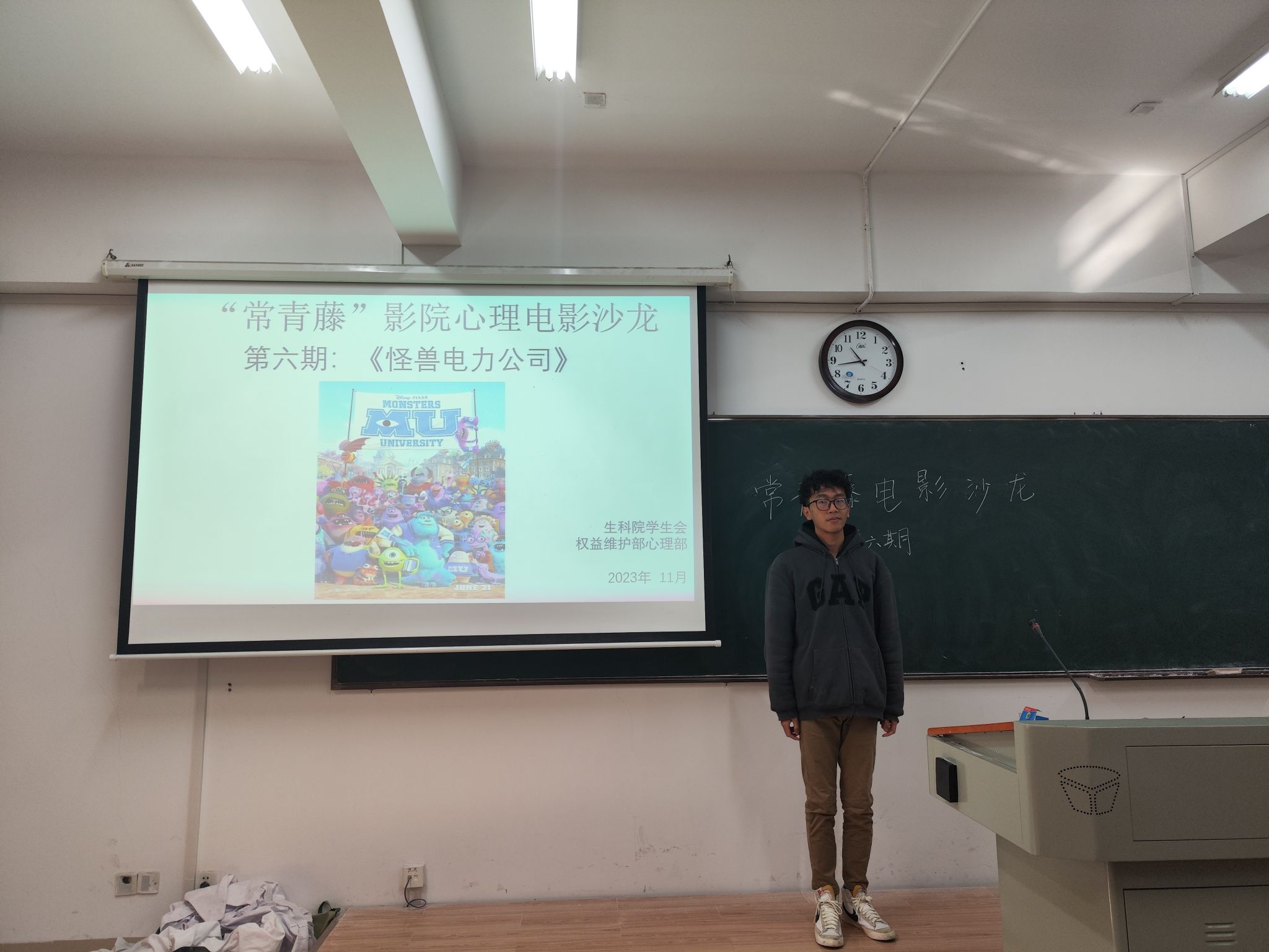 主持人为大家介绍观影的注意事项,提醒同学们在观影过程中保持安静,勿随意走动,以防影响他人观影。同时,他说明影片《怪兽电力公司》主要讲述的是一个人类小孩误闯以惊吓为电力能源的奇幻怪兽公司,在公司中收获了一份友情并将惊吓公司变为笑声公司的故事。该影片让同学们意识到在成长历程中勇气与友情的重要性。为增强同学们的体验感与参与感,主持人组织大家进行心理趣味游戏"数字炸弹",并为获胜的同学颁发奖品。
