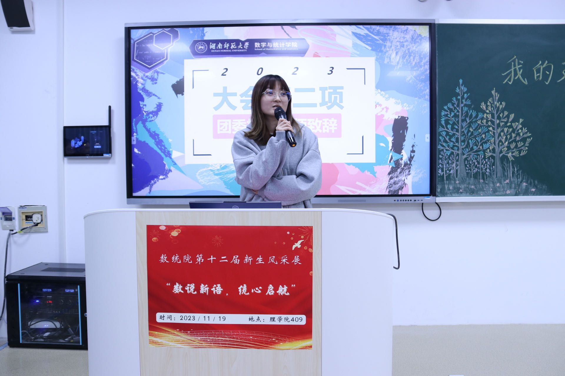 (通讯员 杨滢瑜 周小轩 蒲佳莹)11月19日晚,数学与统计学院(以下简称“数统院”)于格物楼409教室举办以“数说新语,统心启航”为主题的第十二届新生风采展活动。团委指导老师兼2023级辅导员肖惠卿、2023级辅导员刘美参加此次活动。辅导员助理、校团委监察人员、各学院组织部观摩团、2023级新生班指导担任比赛评委。
