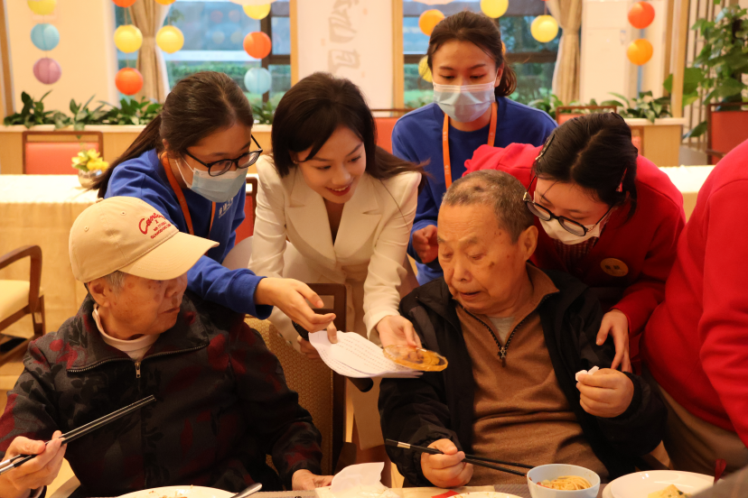 图为志愿者与泰康之家·湘园的老人们进行互动。