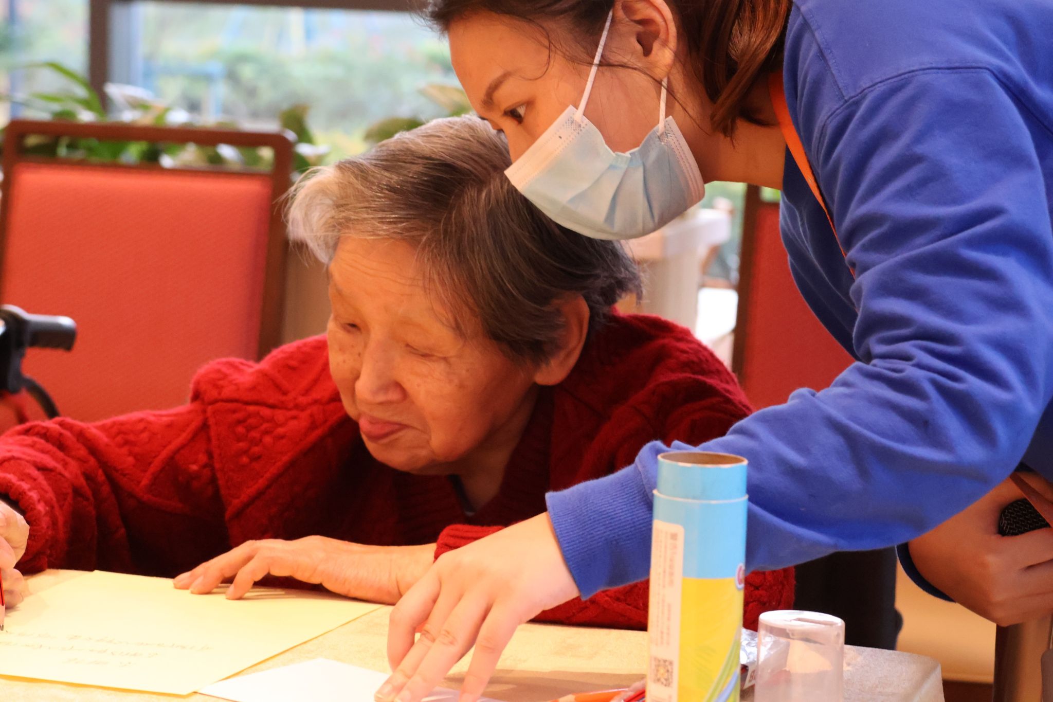 图为志愿者耐心陪伴和细心指导老人进行感恩信的制作。