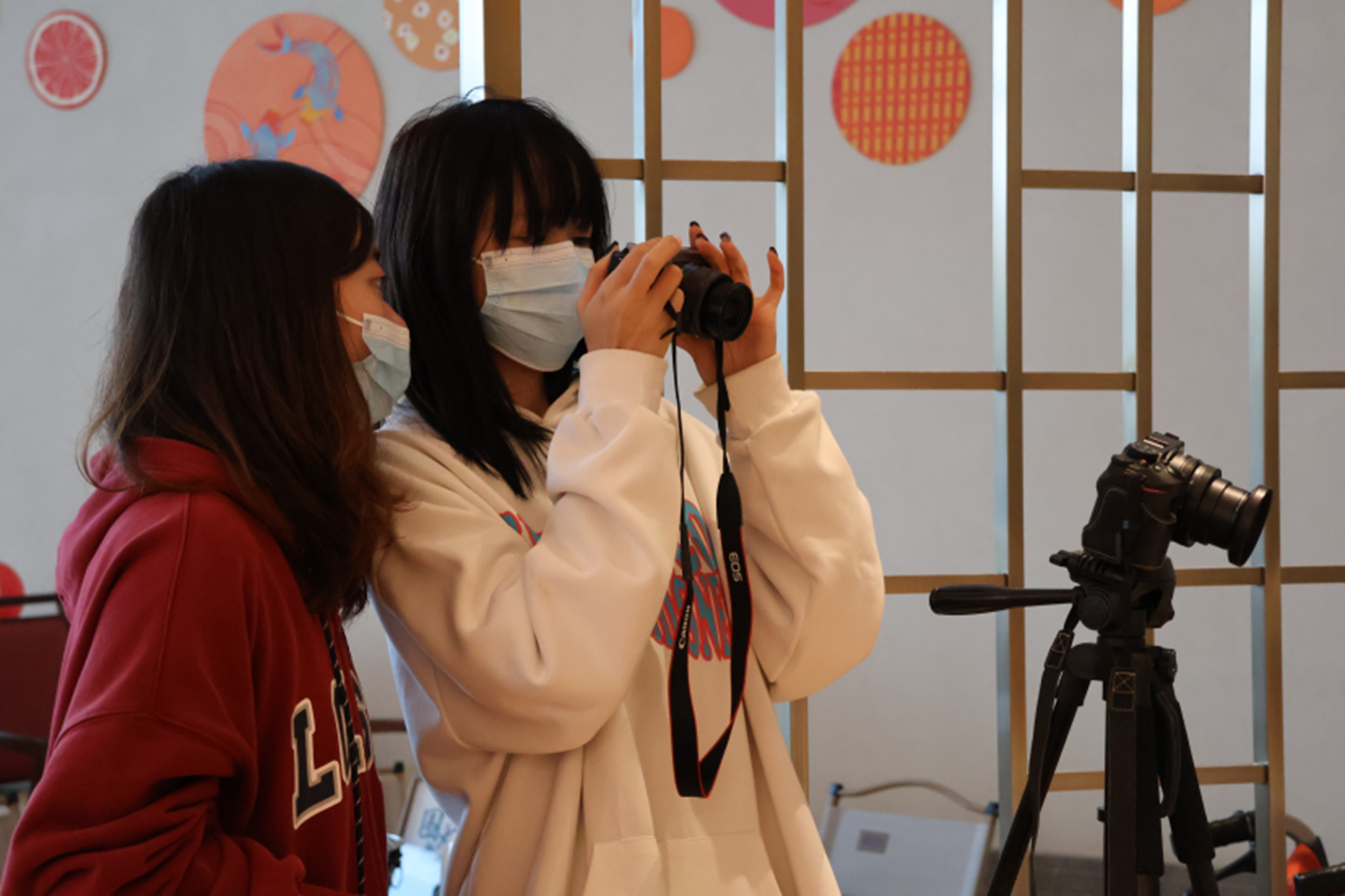 图为志愿者拍摄活动现场的照片,并检查拍摄效果。