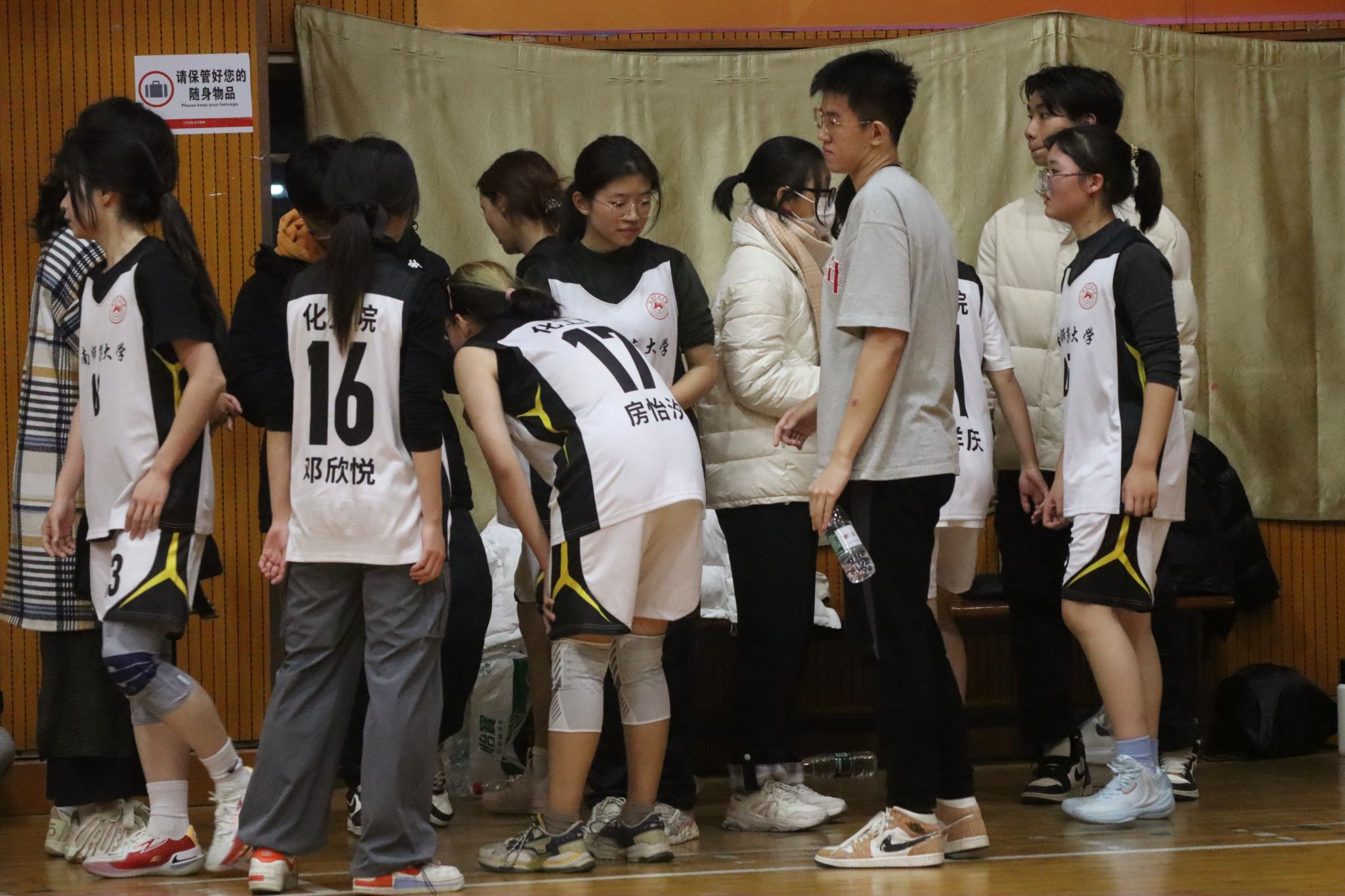 比赛结束后化工院女子篮球队队员着球服合影留念