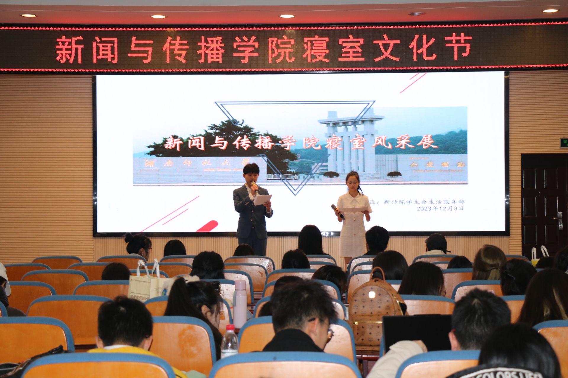(通讯员 李雨轩 林睿斯)为丰富学生校园课余生活,加强寝室文化建设,12月3日下午,新闻与传播学院于书山论坛举行了2023年寝室文化节。新传院党委副书记张小春,院团委书记、2020级辅导员陈安琪,院学工办主任、2021级辅导员欧阳丹玲,2019级辅导员林雅心,2022级辅导员王洋,2020级辅导员贺静一出席此次寝室文化节。此次活动由新传院学生会主办、生活服务部承办。
