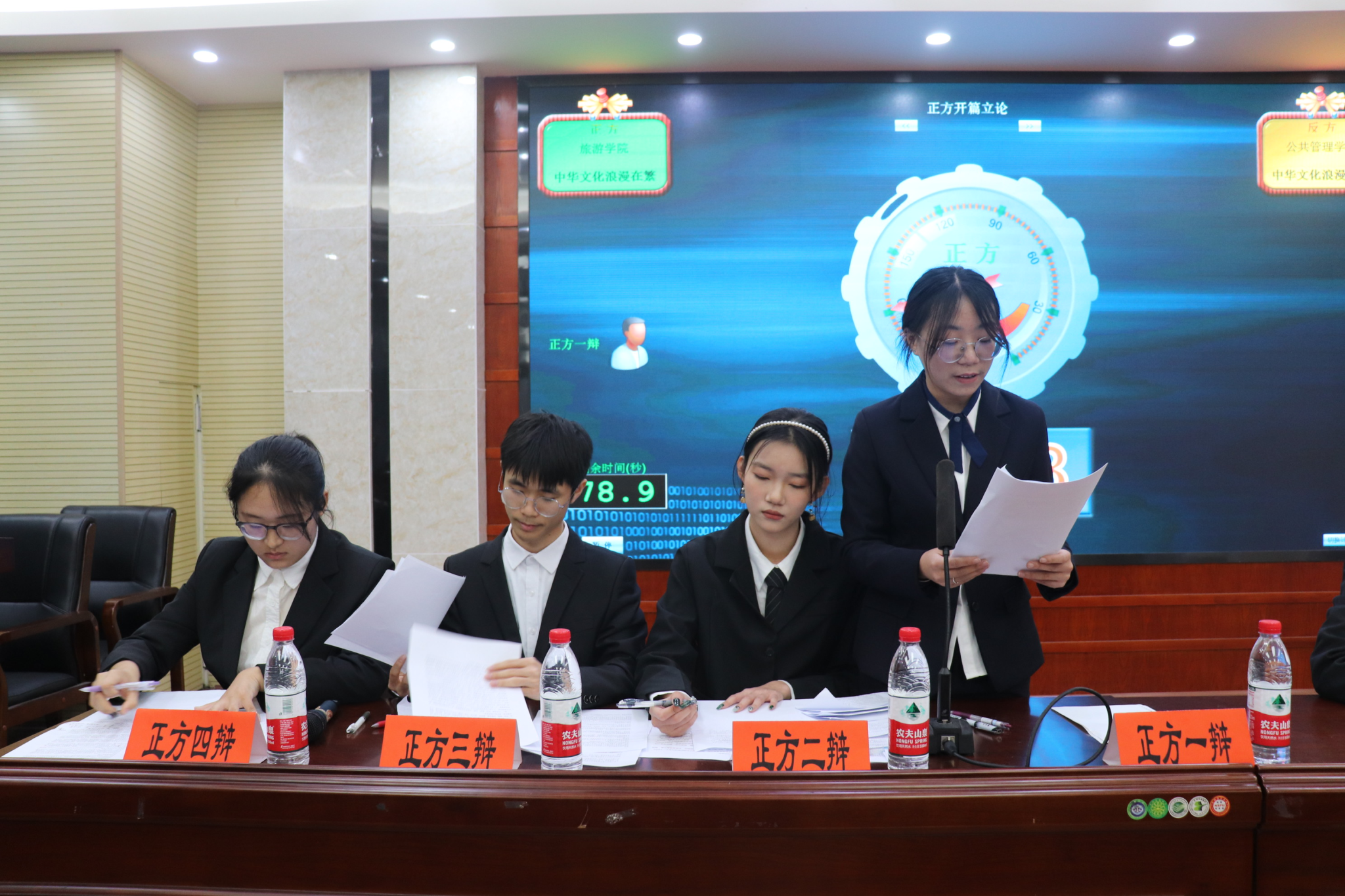 (通讯员 瞿子康 肖皇 曾靖雯)12月3日晚,由我校校辩论队与公共管理学院(以下简称“公管院”)子非鱼思辩社主办,微益俱乐部等八家社团联合协办的2023年度“迎新杯”青年辩论赛决赛在博后楼四楼学术讲堂举行。决赛的对阵双方为旅游学院与公管院,对阵辩题为“中华文化浪漫在繁/简”,正方旅游学院(以下简称“旅院”)的观点是中华文化浪漫在繁,反方公管院的观点是中华文化浪漫在简。