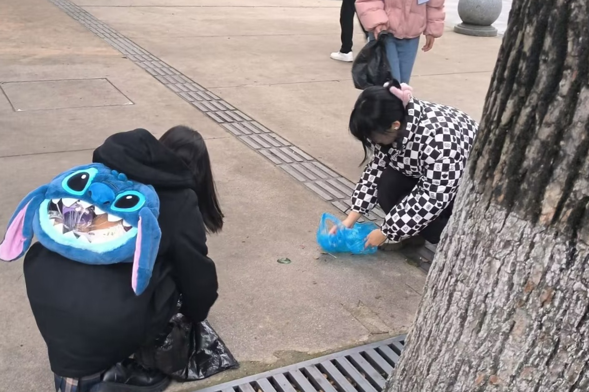 志愿者在麓山路清理垃圾