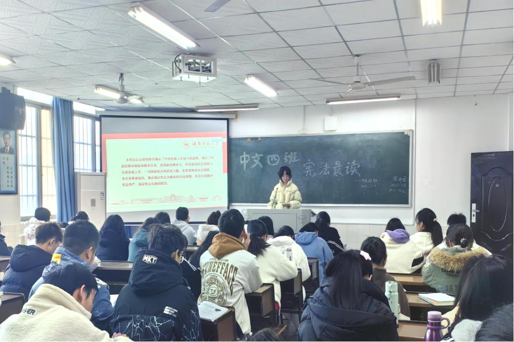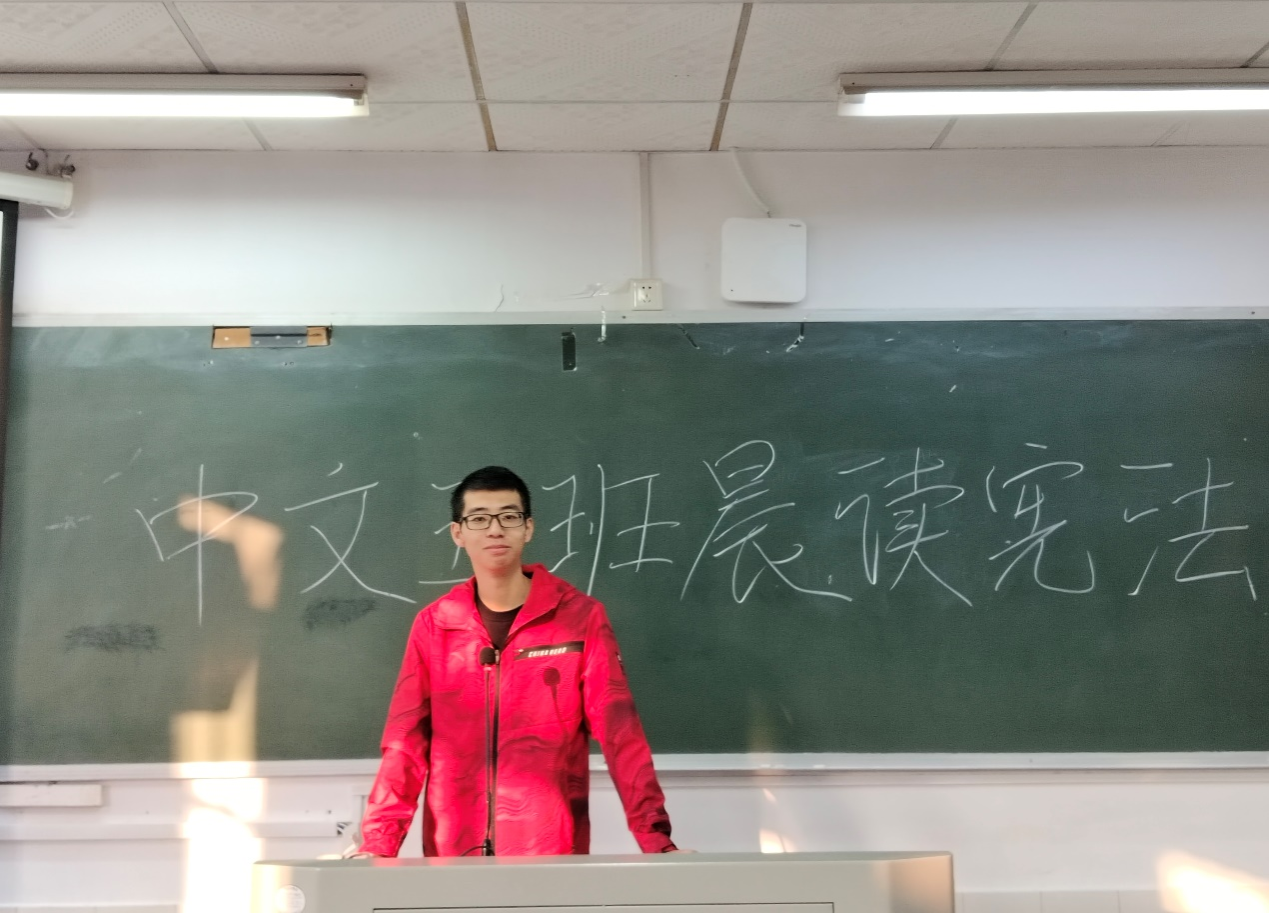 图为2023级汉语国际教育9班同学们在班长田秋云的带领下,全班齐读部分宪法条例。田秋云总结,宪法在赋予公民一定权利的同时也规定了公民必须承担的义务,同学们应成为遵守宪法法律的优秀公民。