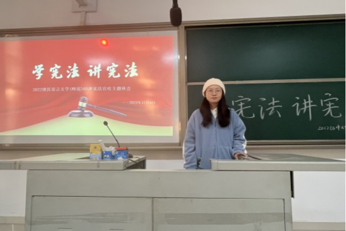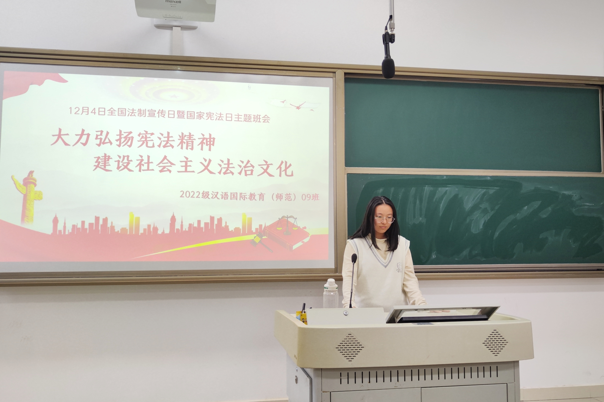 图为2022级汉语国际教育8班班长李天依介绍1949年以来宪法的编写历史及“国家宪法日”的设立历程。她提到,宪法与每位中国公民息息相关,保护着公民利益与国家利益,因此,对于大学生来说,了解宪法知识,感受宪法精神十分重要。