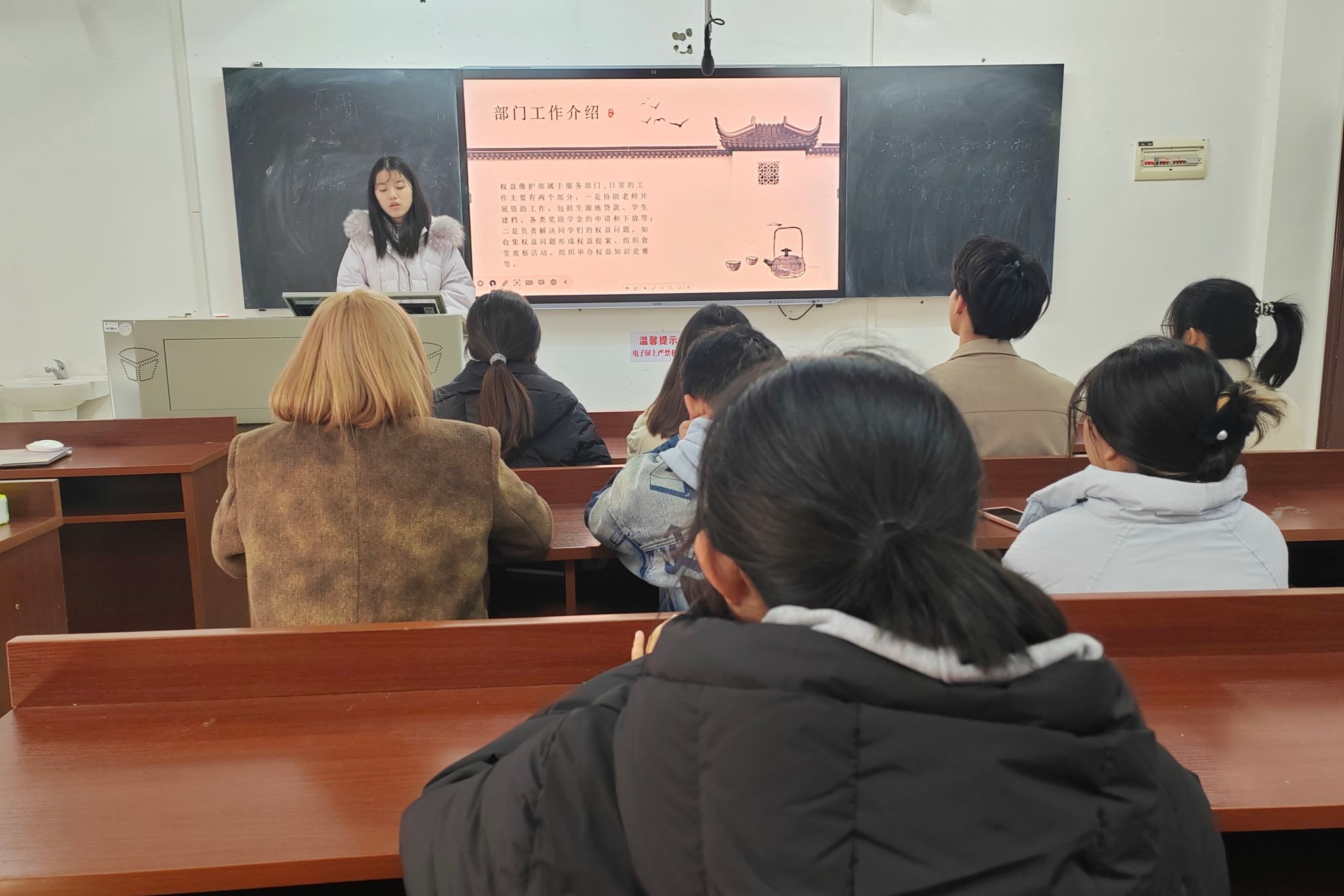 化工院权益部负责人为大家介绍了部门的资助工作和权益工作,并就两方面的工作内容进行了详细的讲解,总结了工作中遇到的问题以及解决方法,她提出:部门出现问题时要及时反思,争取不再犯错,且成员应将问题事无巨细地上报,以探寻更好的解决办法。地科院权益部负责人则根据实际工作情况提到了工作中曾因信息差、审核失误、宣传不到位而遇到的具体问题,并分享了解决过程以供借鉴。