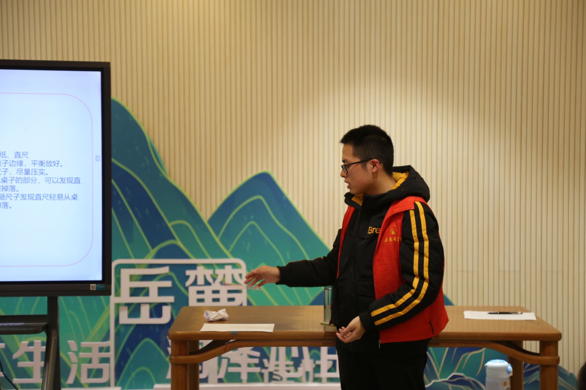 黄浩男为小朋友讲解绘本“无处不在的力”,他从牛顿三大运动定律引入,通过播放动画视频、列举生活实例、提问等方式对三大定律依次进行讲解,帮助小朋友理解抽象概念。与此同时,回答问题的小朋友还得到了志愿者们发放的零食作为奖励。在黄浩男的介绍下,小朋友们了解到两种生活中常见的力——重力和阻力,并在纸张、水瓶等下落运动的演示实验中直观地感受到了重力和阻力的作用。在实验环节中,志愿者为小朋友们分发实验材料后,黄浩男带领小朋友用尺子和纸张完成与大气压强相关的实验,小朋友们进一步体验到了力所产生的作用。