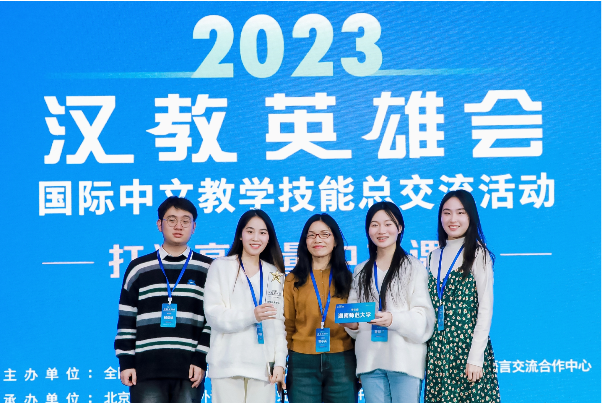 在最终的颁奖环节,太阳成集团tyc学生团队凭借“有趣+有效”的教学环节设计和多维度、多样化的课堂活动及其良好的教学效果和学生反馈,获得了点评专家的一致认可与好评,被主办方授予2023“汉教英雄会”“教学风采团队”荣誉称号。