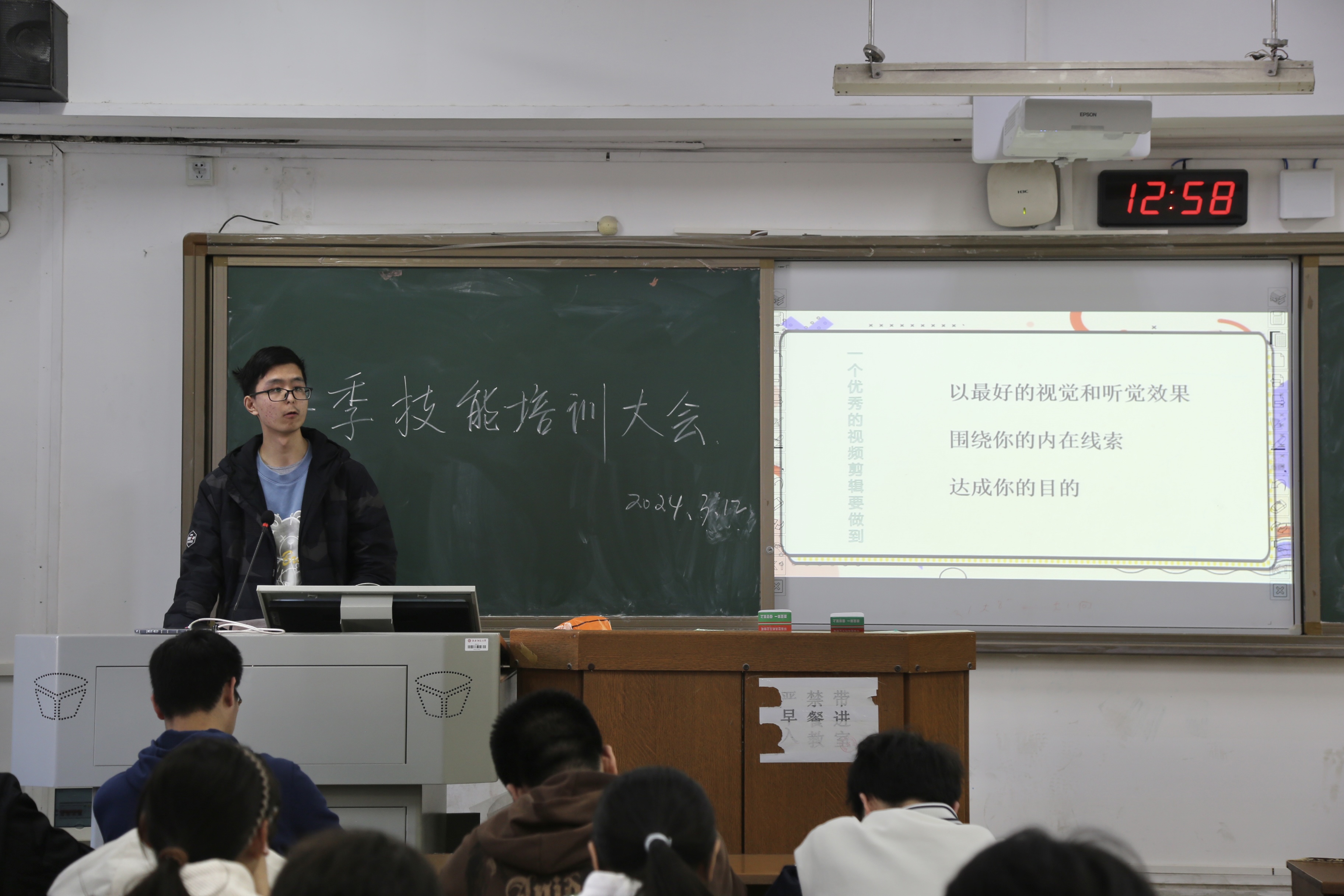 学生会权益部负责人介绍了视频的构思与选材,并着重介绍了如何利用剪映的相关功能。他表示,一项技能的获得需要经过不断的重复练习,希望大家在会议结束后能够多加尝试,在实践中掌握视频剪辑技巧。